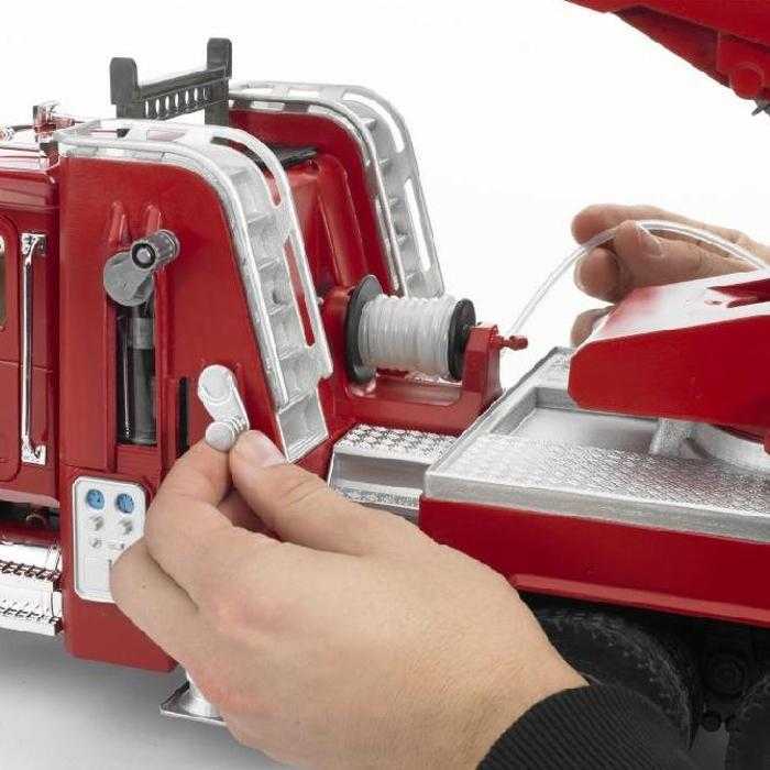 Třínápravový hasičský vůz MACK Granit s funkční stříkačkou a otočným výsuvným žebříkem, který lze vysunout až do délky 120 cm! Výsuvné rameno je otočné o 360°. Nechybí samozřejmě stabilizační podpěry a součástí je také maják se sirénou (BR2801). Hasičský vůz má otevíratelné dveře kabiny, sklopná vnější zrcátka a čelní okno vyrobené z kvalitního průhledného palykarbonátu. Je osazen měkkými profilovanými pneumatikami a je možné nahlédnout pod kapotu na blok motoru. Na košíku žebříku je držák na hadici, kterou lze navíjet pomocí boční kličky. Kompatibilní s postavami Bworld. Vyrobeno v Německu, z kvalitních materiálů.