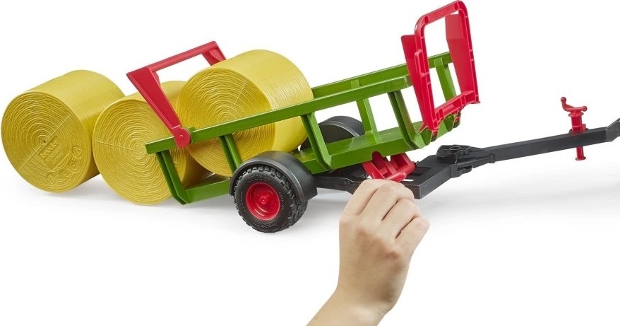 Přepravník, který může převážet 3 balíky slámy. Balíky jsou součástí balení. V moderním zemědělství rozhoduje v terénu hlavně rychlost a efektivita! Přesně to si děti vyzkouší se sběračem kulatých balíků BRUDER. Přívěs lze jednoduše připojit za traktory BRUDER řady 1000 až 3000, případně přímo za lis na kulaté balíky pomocí typického tažného zařízení BRUDER.Chytrým prvkem je boční posun tažné tyče, díky němu lze kulatý balík navést přímo na sběrný mechanismus, odkud se jednoduše zvedne a uloží na ložnou plochu. Jakmile je čas vyložit, stačí otevřít zámky a sklopit ložnou plochu a balíky jsou během chvilky zpět na zemi a práce může pokračovat...