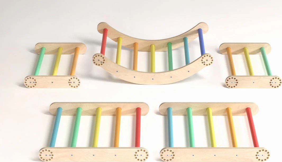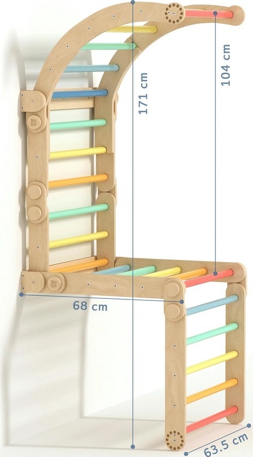 Mít vlastní herní park přímo doma to je sen každého dítěte. A co teprve žebřinovou horolezeckou stěnu s hrazdou na konci! Tato velká lezecká stěna je vhodná pro menší děti i pro ty, které už rády zdolávají výšky. Žebřiny se skládají ze třech prvků. Dvou trojúhelníků a jednoho balančního oblouku. Velký trojúhelník má rozměry 51,5 x 63,5 x 66 cm (výška × hloubka × šířka), malý trojúhelník 31,5 × 63,5 × 43,5 cm (výška × hloubka × šířka) a balanční oblouk je o rozměrech 21 × 63,5 × 75 cm (výška × hloubka × šířka). Tato velká lezecká sada pro děti kombinuje 2 trojúhelníky a malou houpací desku s možností upevnění na stěnu. Sestavu je možné použít na zemi k plazení, stání, lezení a ke zkoušení různých variací hry dle věku a dovedností a speciální stěnové upevnění pak transformuje tento modul na skutečnou horolezeckou stěnu, která je ideální pro rozvoj motorických dovedností. Díky variabilnímu designu bude tato sada růst spolu s dítětem, od plazení a lezení až po náročnější horolezecké výzvy. Produkt je vyroben z kvalitní březové překližky, barevné odchylky, suky či drobné opravy ve dřevě jsou přirozené a dodávají výrobku jedinečný charakter.