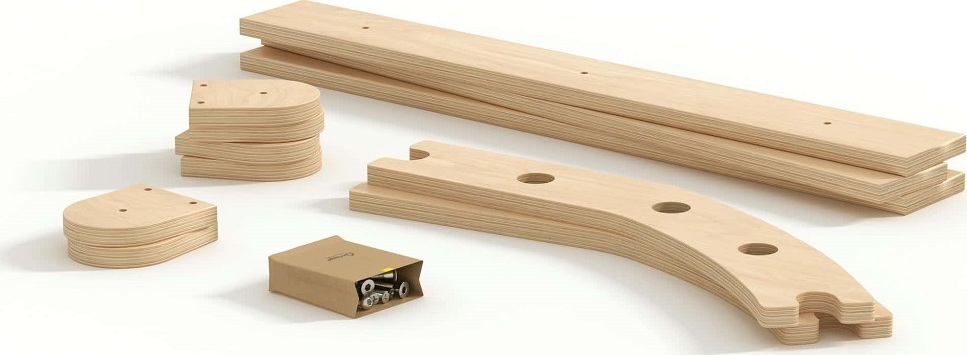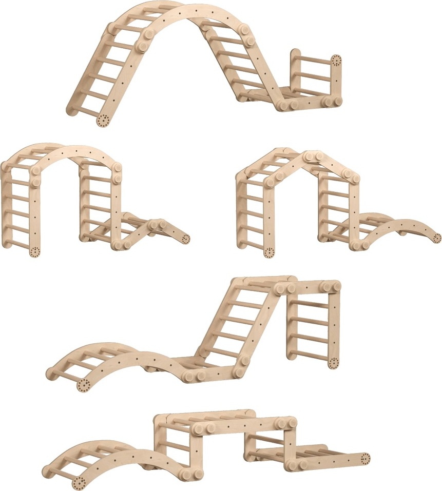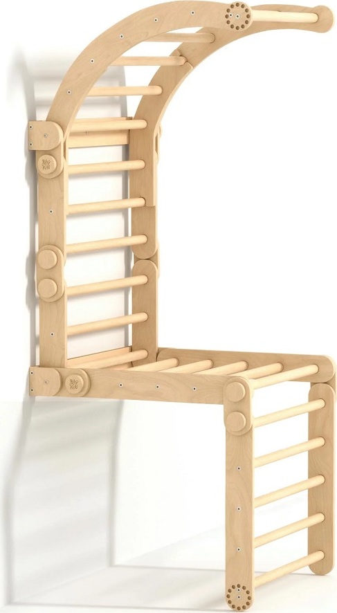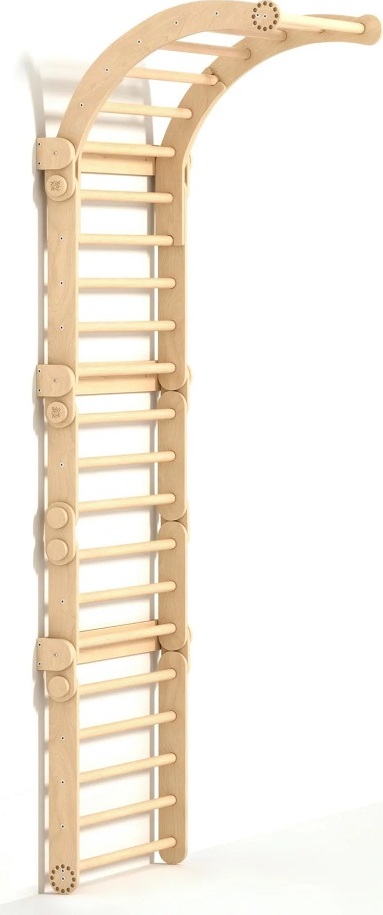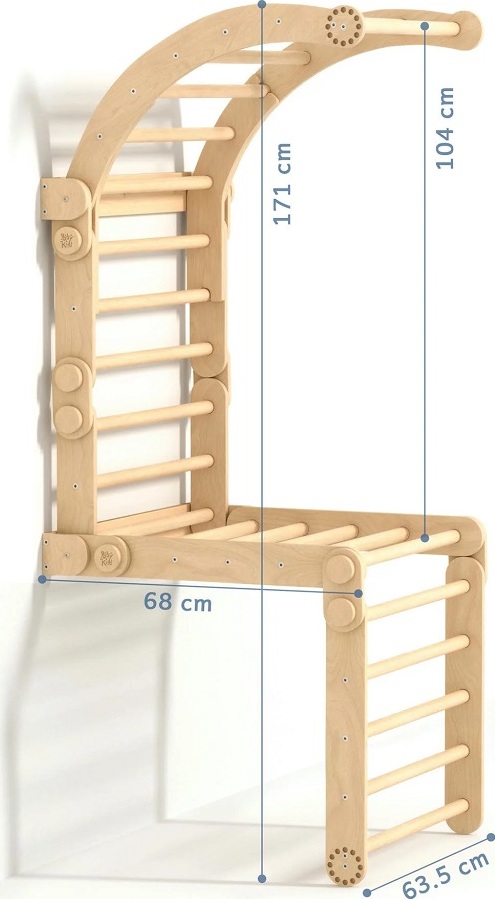 Mít vlastní herní park přímo doma to je sen každého dítěte. A co teprve žebřinovou horolezeckou stěnu s hrazdou na konci! Tato velká lezecká stěna je vhodná pro menší děti i pro ty, které už rády zdolávají výšky. Žebřiny se skládají ze třech prvků. Dvou trojúhelníků a jednoho balančního oblouku. Velký trojúhelník má rozměry 51,5 x 63,5 x 66 cm (výška × hloubka × šířka), malý trojúhelník 31,5 × 63,5 × 43,5 cm (výška × hloubka × šířka) a balanční oblouk je o rozměrech 21 × 63,5 × 75 cm (výška × hloubka × šířka). Tato velká lezecká sada pro děti kombinuje 2 trojúhelníky a malou houpací desku s možností upevnění na stěnu. Sestavu je možné použít na zemi k plazení, stání, lezení a ke zkoušení různých variací hry dle věku a dovedností a speciální stěnové upevnění pak transformuje tento modul na skutečnou horolezeckou stěnu, která je ideální pro rozvoj motorických dovedností. Díky variabilnímu designu bude tato sada růst spolu s dítětem, od plazení a lezení až po náročnější horolezecké výzvy. Produkt je vyroben z kvalitní březové překližky, barevné odchylky, suky či drobné opravy ve dřevě jsou přirozené a dodávají výrobku jedinečný charakter.