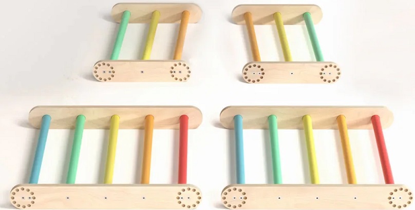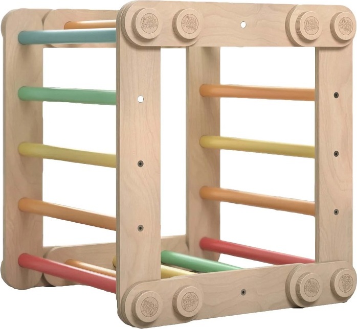 Mít vlastní herní park přímo doma to je sen každého dítěte. Tato malá lezecká sada nabízí mnoho variant sestavení, které snadno změníte bez použití nářadí. Je vhodná pro menší děti i pro ty, které už rády zdolávají výšky. Díky kombinaci přírodního dřeva a nádherných duhových barev se stane atraktivní součástí dětského pokoje nebo herny. Sestava se skládá ze dvou trojúhelníku. Velký trojúhelník má rozměry 51,5 x 63,5 x 66 cm (výška × hloubka × šířka) a malý trojúhelník je o rozměrech 31,5 × 63,5 × 43,5 cm (výška × hloubka × šířka). Produkt je vyroben z kvalitní březové překližky; barevné odchylky, suky či drobné opravy ve dřevě jsou přirozené a dodávají výrobku jedinečný charakter.