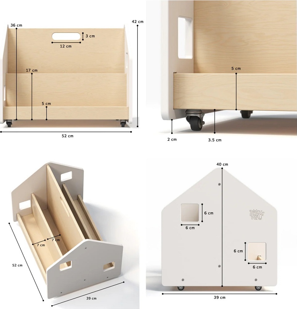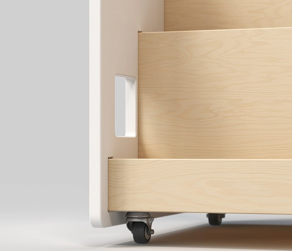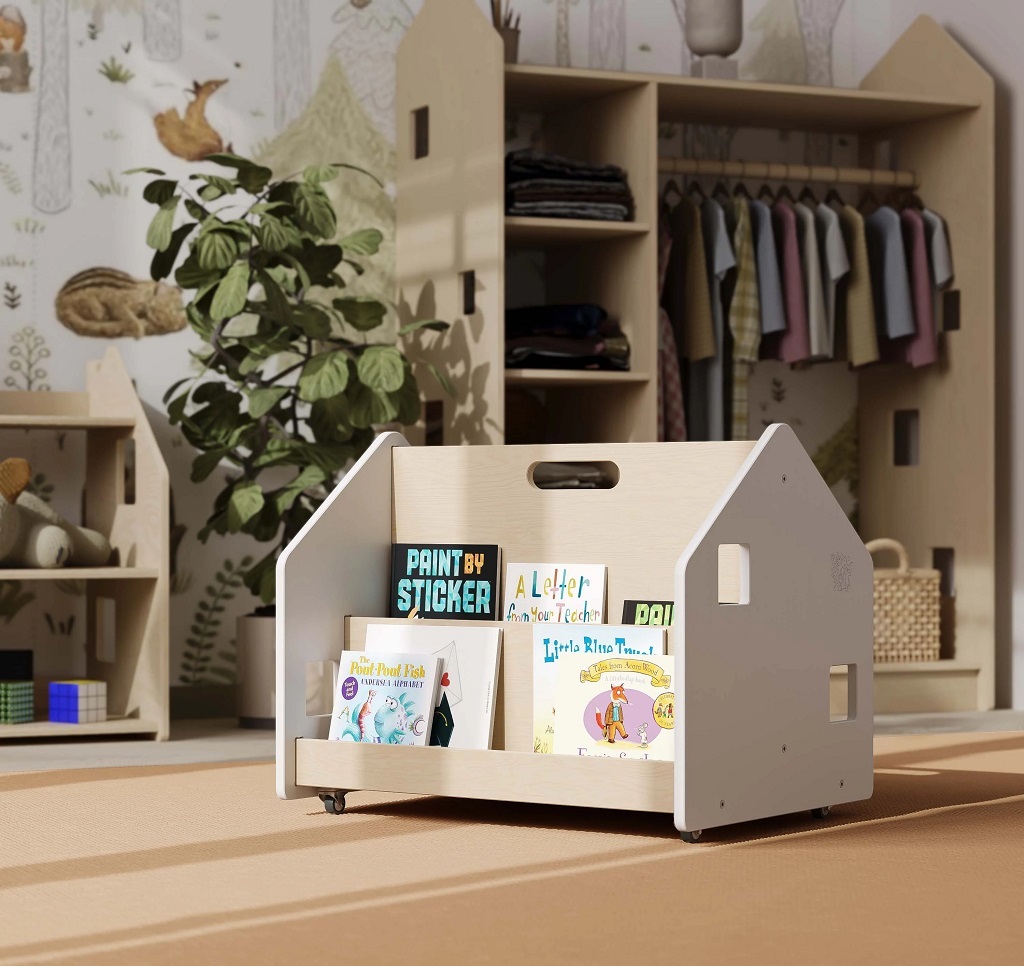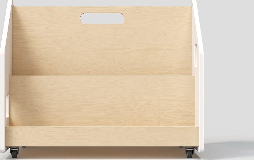 Oboustranná knihovna na kolečkách je praktické a bezpečné řešení do dětského pokoje. Knihy jsou v ní uložené tak, aby děti viděly jejich obálky a mohly si samostatně vybrat to, co je zaujme. Podporuje tak nezávislost i přirozenou lásku ke čtení. Díky kolečkům lze knihovnu snadno přesunout tam, kde je zrovna potřeba. Její design je ekologický, bezpečný a maximálně přátelský k dětem.Knihovna je vyrobena z kvalitní lakované březové překližky a její stabilní konstrukce s hladce zaoblenými hranami zajišťuje maximální bezpečnost.