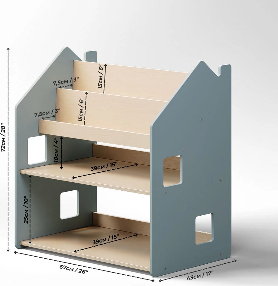 Tato police na hračky a knihy je navržena tak, aby podporovala dětskou samostatnost i pořádek. Díky přehlednému uspořádání si děti mohou samy vybírat a ukládat knihy i hračky, přičemž obálky knih jsou krásně viditelné a lákají ke čtení. Police nabízí čtyři prostorné regály a zadní úložný prostor vhodný pro knihy či hračky. Robustní a bezpečná konstrukce s pečlivě zaoblenými hranami je ošetřena lakem na vodní bázi. Díky jednoduchému, čistému designu krásně zapadne do každého interiéru. Součástí balení je samotná police, přehledný montážní návod i potřebné nářadí. Police je vyrobena z kvalitní lakované březové překližky a její stabilní konstrukce s hladce zaoblenými hranami zajišťuje maximální bezpečnost.