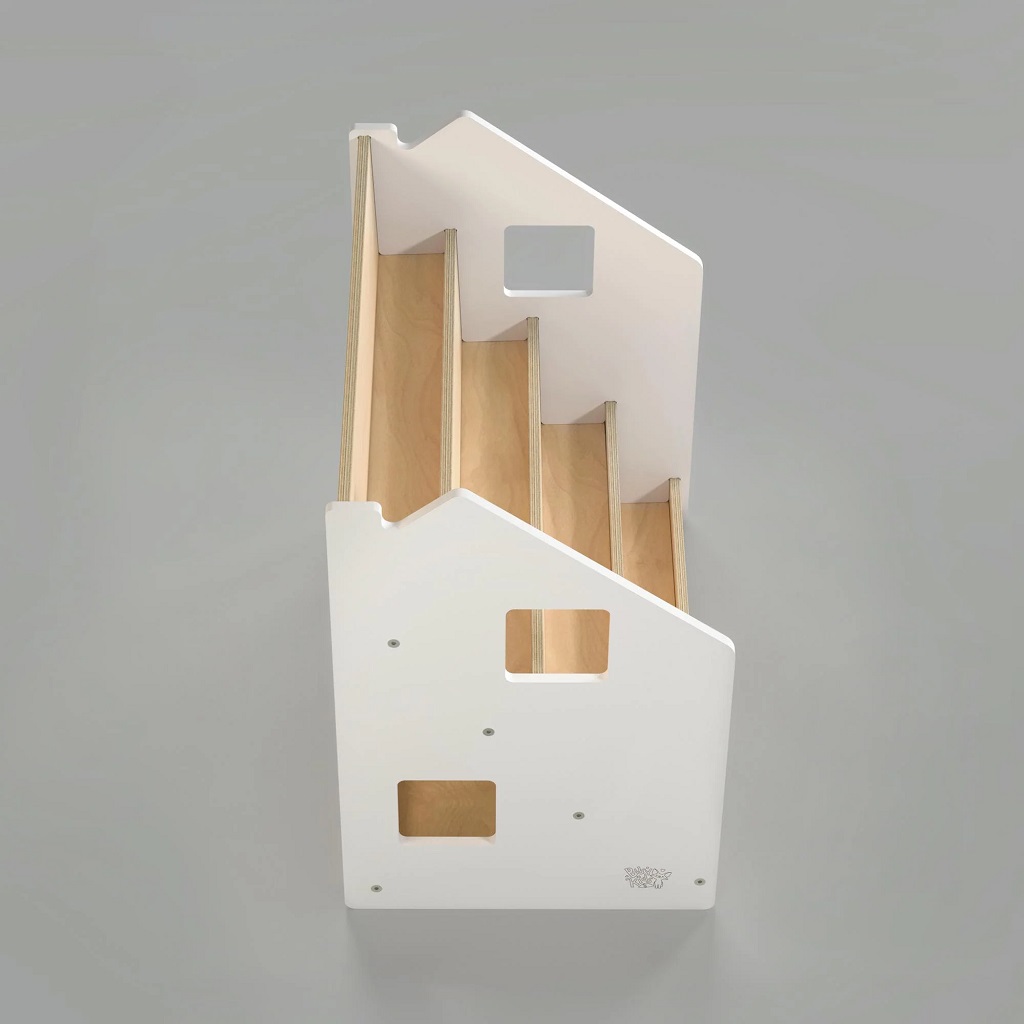 Tento stojan na knihy je navržen tak, aby podporoval dětskou samostatnost a rozvíjel jejich zájem o čtení. Díky tomu, že jsou knížky vidět obálkami dopředu, děti si snadno vyberou tu, která je zaujme a po přečtení ji zase jednoduše vrátí na místo. Police nabízí čtyři prostorné regály a zadní úložný prostor vhodný pro knihy či hračky. Robustní a bezpečná konstrukce s pečlivě zaoblenými hranami je ošetřena lakem na vodní bázi. Díky jednoduchému, čistému designu krásně zapadne do každého interiéru. Stojan je vyroben z kvalitní březové překližky a barevné odchylky, uzly či drobné opravy ve dřevě jsou přirozené a dodávají výrobku jedinečný charakter.