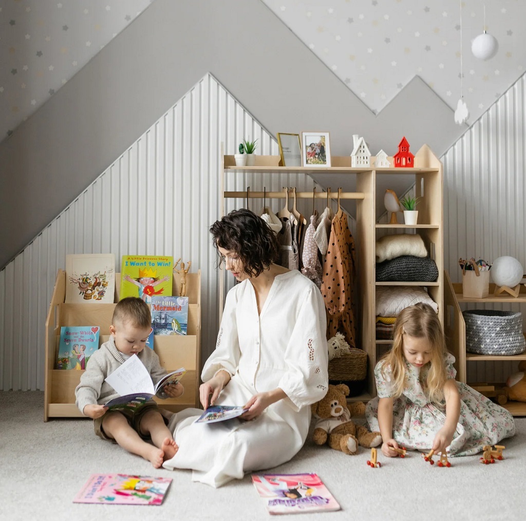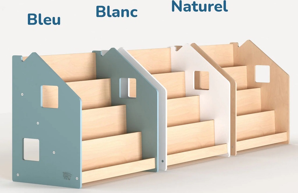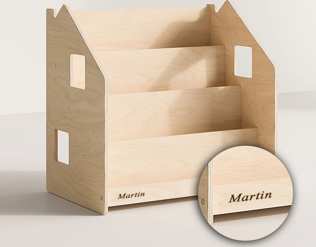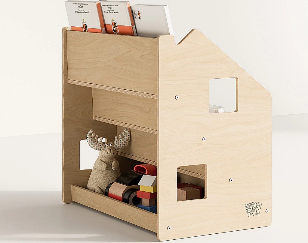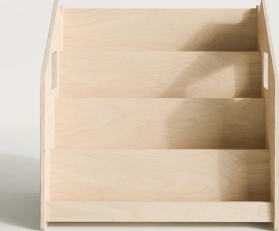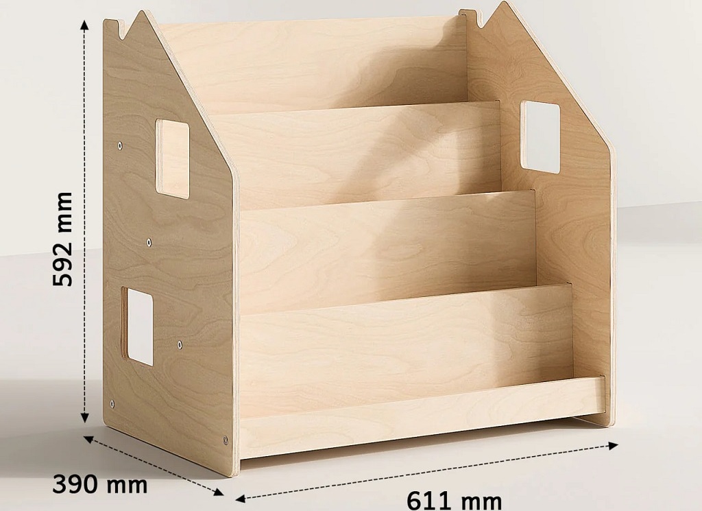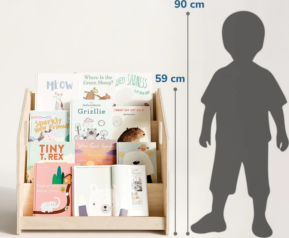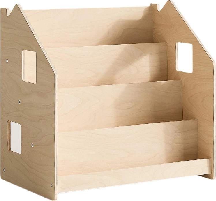 Tento stojan na knihy je navržen tak, aby podporoval dětskou samostatnost a rozvíjel jejich zájem o čtení. Díky tomu, že jsou knížky vidět obálkami dopředu, děti si snadno vyberou tu, která je zaujme a po přečtení ji zase jednoduše vrátí na místo. Police nabízí čtyři prostorné regály a zadní úložný prostor vhodný pro knihy či hračky. Robustní a bezpečná konstrukce s pečlivě zaoblenými hranami je ošetřena lakem na vodní bázi. Díky jednoduchému, čistému designu krásně zapadne do každého interiéru. Stojan je vyroben z kvalitní březové překližky a barevné odchylky, uzly či drobné opravy ve dřevě jsou přirozené a dodávají výrobku jedinečný charakter.