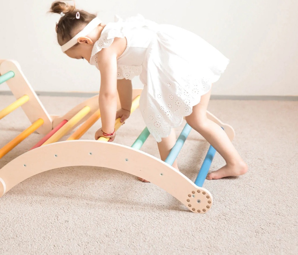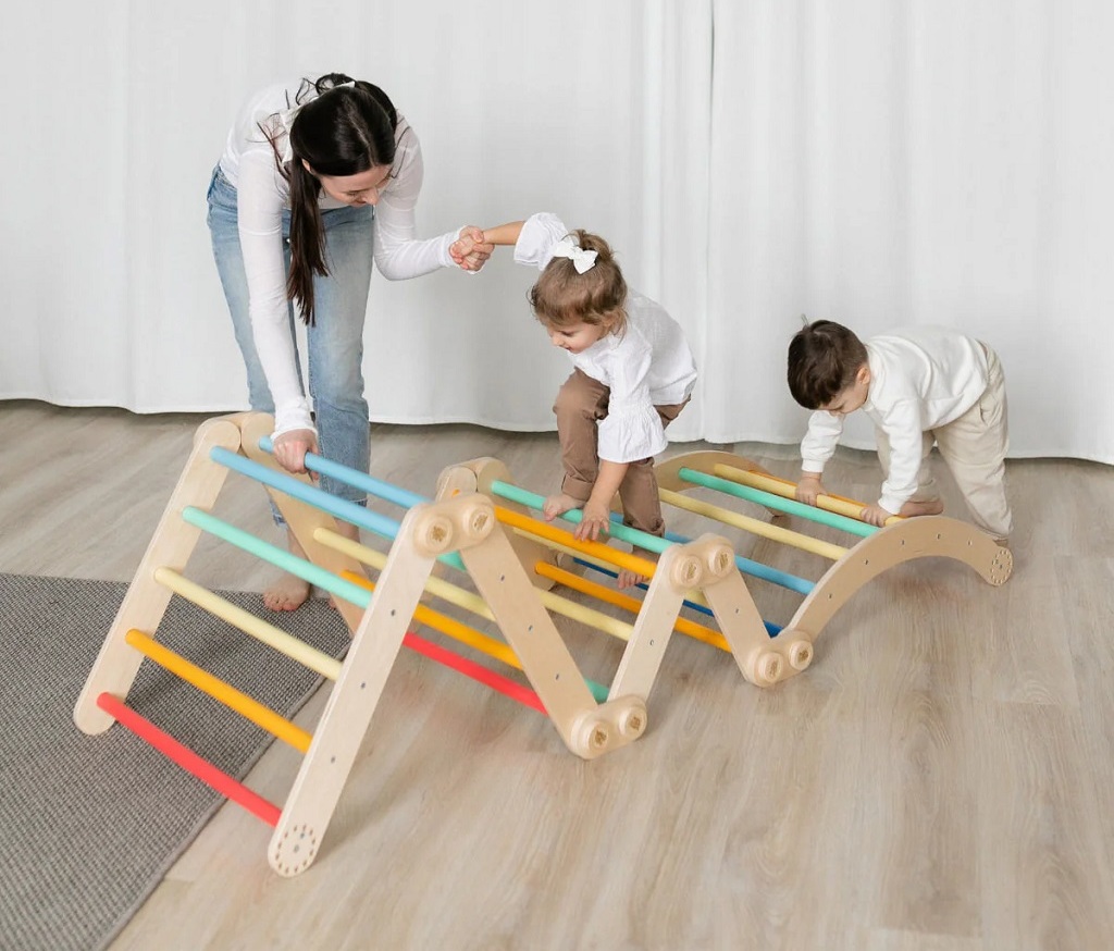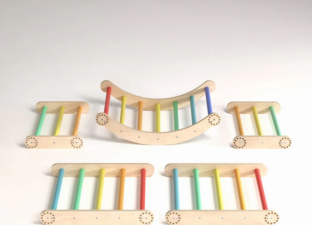 Mít vlastní herní park přímo doma to je sen každého dítěte. Tato velká lezecká sada nabízí desítky variant sestavení, které snadno změníte bez použití nářadí. Je vhodná pro menší děti i pro ty, které už rády zdolávají výšky. Díky kombinaci přírodního dřeva a nádherných duhových barev se stane atraktivní součástí dětského pokoje nebo herny.Sestava se skládá ze třech prvků. Dvou trojúhelníků a jednoho balančního oblouku. Velký trojúhelník má rozměry 51,5 x 63,5 x 66 cm (výška × hloubka × šířka), malý trojúhelník 31,5 × 63,5 × 43,5 cm (výška × hloubka × šířka) a balanční oblouk je o rozměrech 21 × 63,5 × 75 cm (výška × hloubka × šířka). Produkt je vyroben z kvalitní březové překližky; barevné odchylky, suky či drobné opravy ve dřevě jsou přirozené a dodávají výrobku jedinečný charakter.