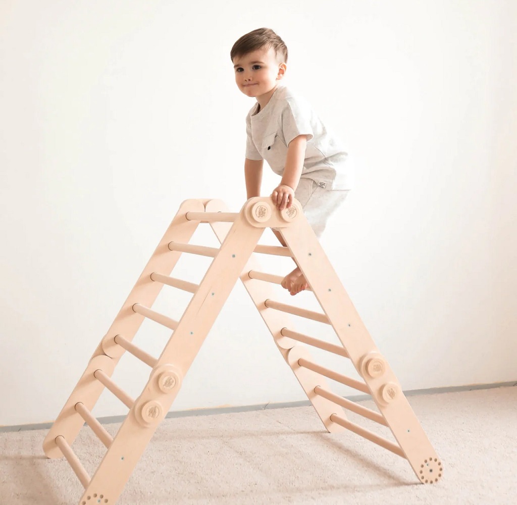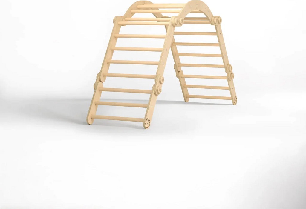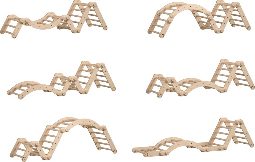 Mít vlastní herní park přímo doma to je sen každého dítěte. Tato velká lezecká sada nabízí desítky variant sestavení, které snadno změníte bez použití nářadí. Je vhodná pro menší děti i pro ty, které už rády zdolávají výšky. Sestava se skládá ze třech prvků. Dvou trojúhelníků a jednoho balančního oblouku. Velký trojúhelník má rozměry 51,5 x 63,5 x 66 cm (výška × hloubka × šířka), malý trojúhelník 31,5 × 63,5 × 43,5 cm (výška × hloubka × šířka) a balanční oblouk je o rozměrech 21 × 63,5 × 75 cm (výška × hloubka × šířka). Produkt je vyroben z kvalitní březové překližky; barevné odchylky, suky či drobné opravy ve dřevě jsou přirozené a dodávají výrobku jedinečný charakter.