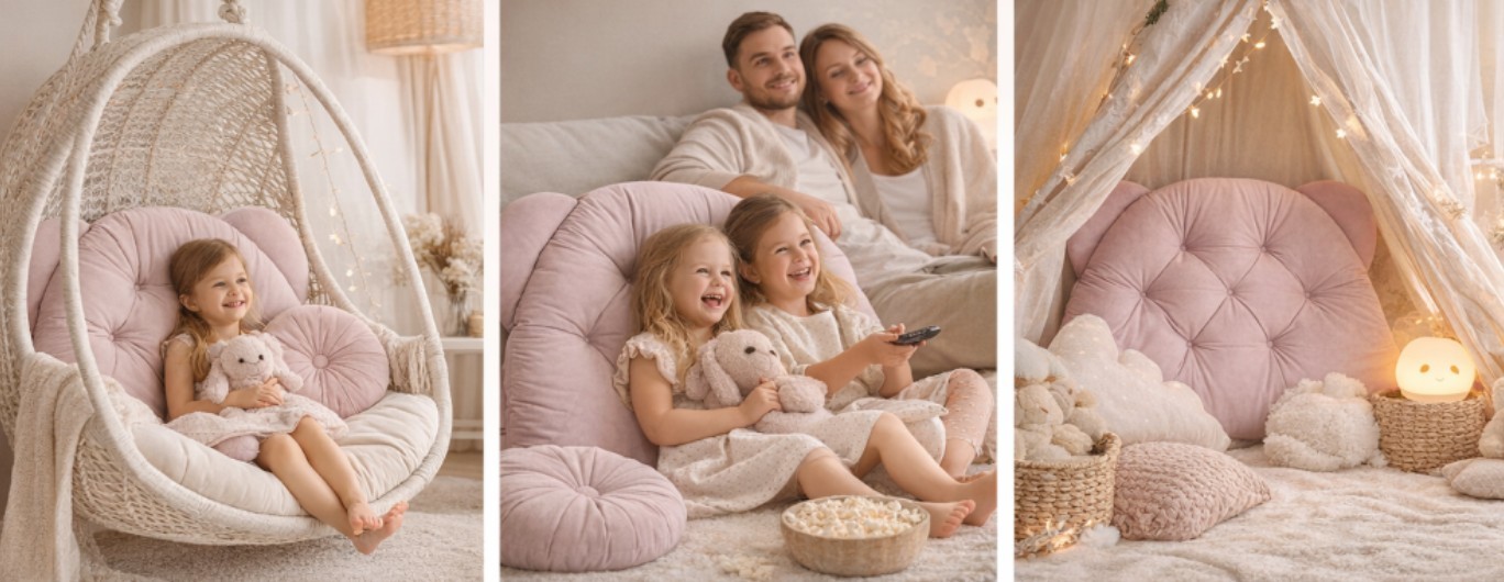 Opěrka hlavy může sloužit jako dekorativní polštář/opěradlo na pohovce, lavici v chodbě nebo lenošce. Měkký samet a prošívání vytvářejí stylový doplněk. Ať už se společně díváte na film, čtete si nebo si hrajete na podlaze, opěrka hlavy slouží jako přenosné měkké opěradlo – kdekoli ji potřebujete. Lehká, všestranná a připravená k použití v jakékoli části domu.