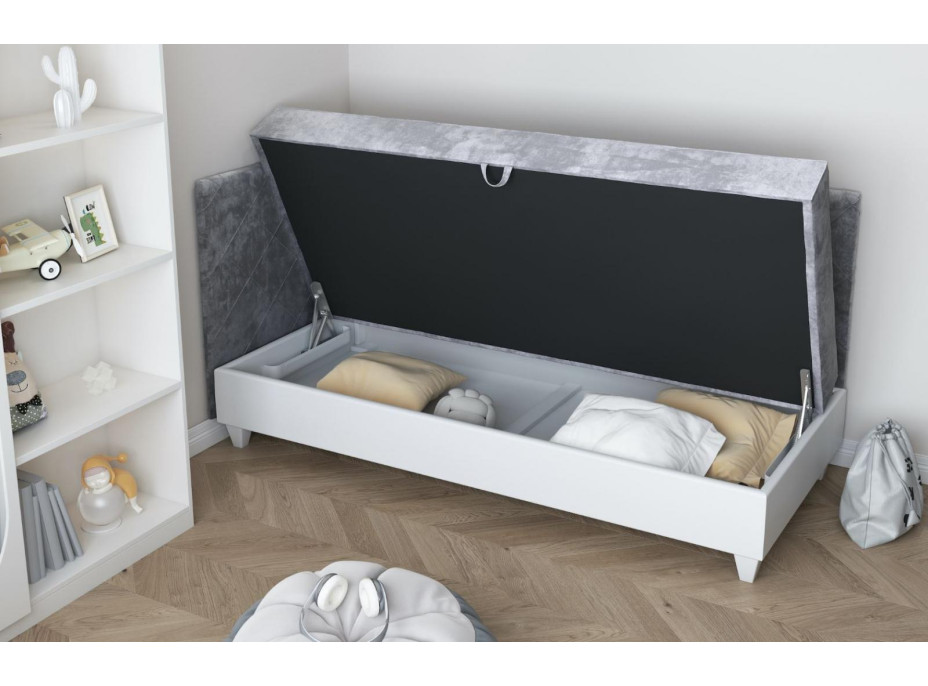 Čalouněná postel LAGOS I s praktickým úložným prostorem na lůžkoviny má příjemný látkový povrch. Díky tomuto řešení je postel pohodlná na spaní a zároveň praktická pro každodenní použití. Látkové čalounění a vysoké čelo dodává posteli elegantní nádech. Úložný prostor je potažen ekokůží v bílé barvě. Rozměry spací plochy 200x90 cm jsou vhodné pro jednu osobu, takže je tato postel ideální do malých ložnic či pokojů nebo pro lidi, kteří potřebují místo na spaní, ale nemají v místnosti mnoho místa. Látkový potah matrace poskytuje při spánku větší pohodlí. Postel dodáváme s pěnovou matrací nebo pružinovou bonelovou matrací s výškou 14 cm.