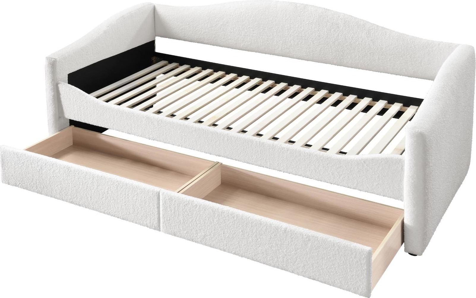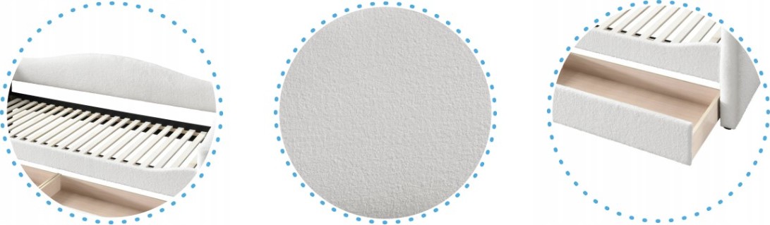 Posuňte svou ložnici na vyšší úroveň elegance a funkčnosti s jednolůžkem CAYDENCE se zásuvkami. Tato kombinace vynikajícího designu a praktických řešení udělá z vašeho pokoje skutečnou oázu relaxace a stylu. Díky vestavěným zásuvkám, perfektním pro lůžkoviny, oblečení a další potřebné věci, bude vaše ložnice vždy uklizená. Postel vyrobená z nejkvalitnější boucle látky vyzařuje nenápadný luxus. Její krémová barva dodává interiéru jemnost a harmonii a vytváří útulnou atmosféru napomáhající relaxaci. Jednolůžko CAYDENCE nabízí nejen komfort spánku, ale také praktické úložné řešení. Je to vynikající volba pro ty, kteří si v každodenním životě cení jak estetiku, tak funkčnost. Matrace není součástí postele.