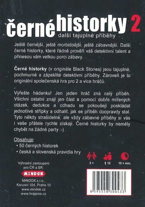 Černé historky 2 jsou tajuplné, pochmurné a zapeklité detektivní příběhy. Zárověň je to originální společenská hra pro 2 a více hráčů. Ještě černější, ještě morbidnější, ještě zábavnější! Další černé historky, které řádně prověří váš detektivní talent a přinesou vám velkou porci zábavy. Vyřeště hádanku! Jen jeden hráč zná celý příběh. Všichni ostatní znají jen část a pomocí dobře mířených otázek, dedukce a odhadu se pokoušejí poskládat jednotlivé střípky a odhalit, jak se příběh doopravdy stal. Tyto někdy strašidelné, ale vždy zábavné příběhy si vás i vaše přátele rychle získají. Černé historky by neměly chybět na žádné párty!