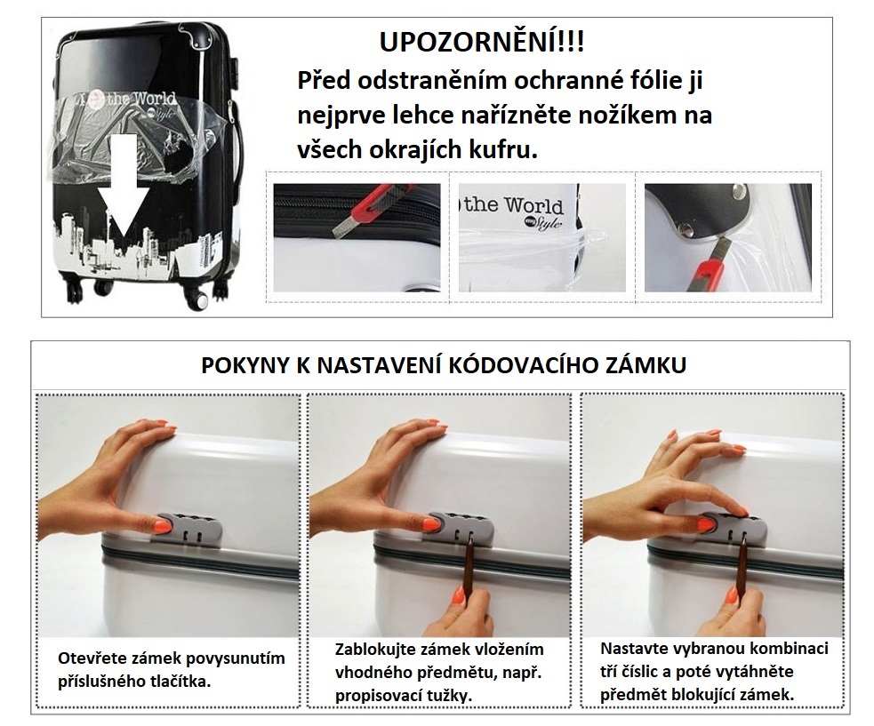 Všechny námi nabízené kufry jsou zcela nové a zdravotně nezávadné. Při výrobě jsou standardně opatřeny ochrannou fólií, kterou jednoduše odstraníte. Před odlepením fólie ji nejprve lehce nařízněte nožíkem na všech okrajích kufru a kolem všech spojovacích komponentů.