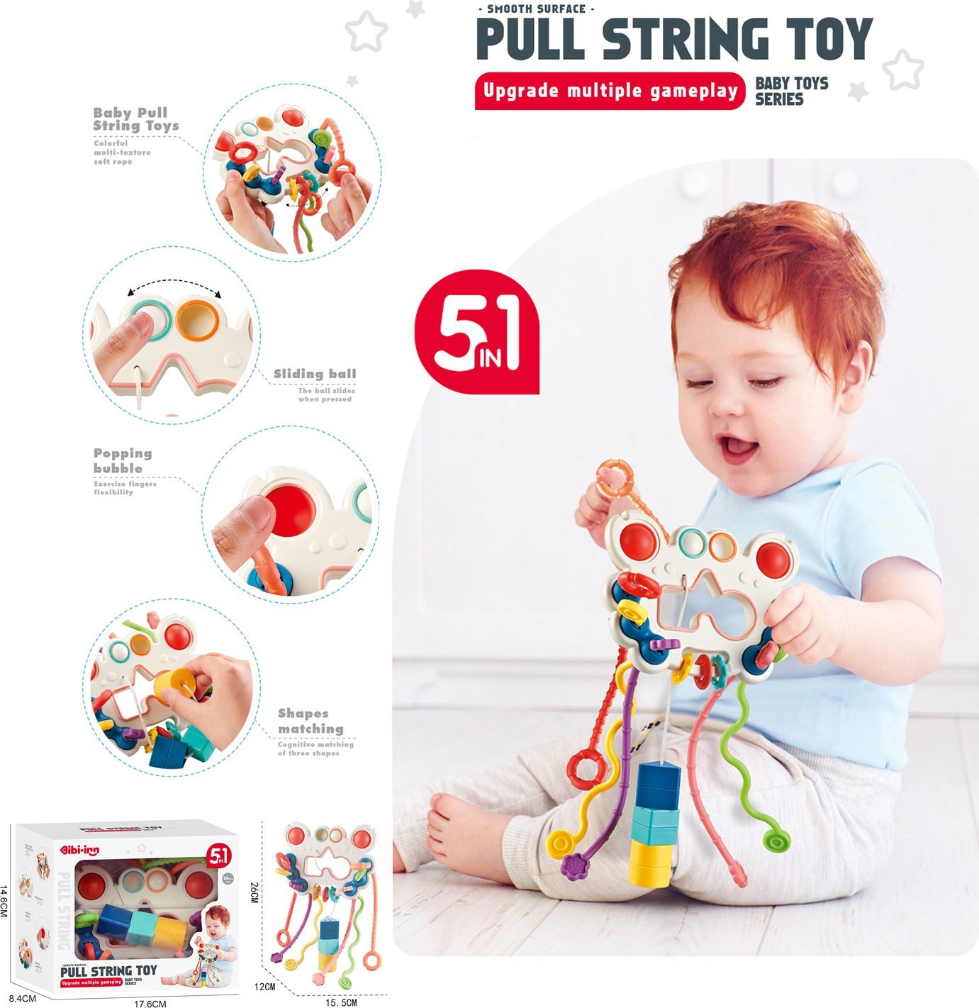 Hračka obsahuje pět aktivit na hraní, díky kterým se dítě seznámí s různými tvary a barvami.