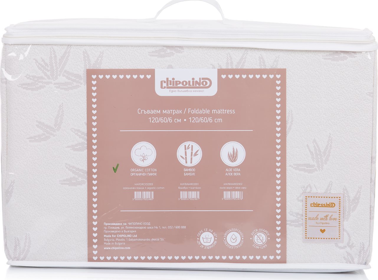 Skládací matrace CHIPOLINO je vhodná do postýlek o rozměrech 120 x 60 cm. Bambus má jedinečnou vlastnost udržovat přirozenou tělesnou teplotu - v létě chladí a v zimě hřeje. Díky němu jsou textilie mimořádně měkké a svěží a chrání je před bakteriemi a mikroorganismy. Hypoalergenní a protiroztočová. Jádro je vyrobeno z vysoce kvalitní polyesterové pěny, která má vynikající ortopedické vlastnosti v kombinaci s vysokou pevností a pružností. Potah je vyroben z prvotřídní textilie obohacené bambusovými vlákny. Snadno snímatelný potah lze prát v pračce při max 40°C. Snadné a kompaktní skládání. Vhodná na cesty. Rozměry matrace: 120 x 60 x 6 cm. Hmotnost: 1 kg.Vlastnosti