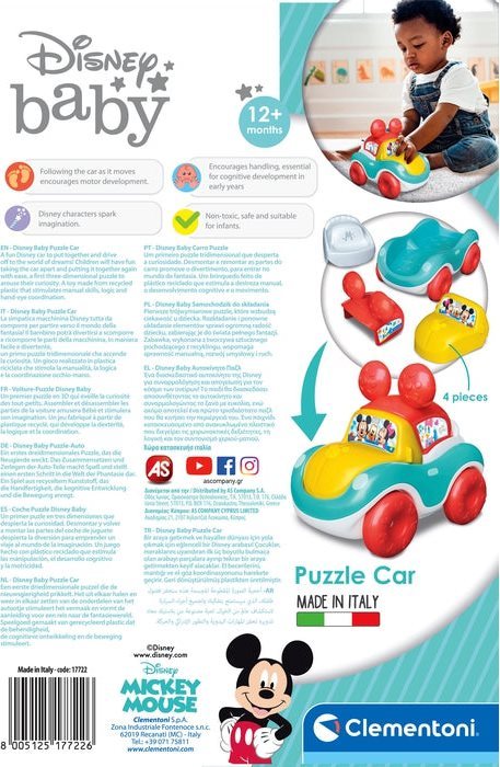 Skládací autíčko s motivem oblíbených postaviček Disney. 4 části autíčka - snadné skládání rozvíjí logiku a koordinaci pohybu vyrobeno z více než 80% recyklovaného plastu netoxické materiály a vysoká kvalita po dosloužení opět 100% recyklovatelné Výrobek patří do ekologického programu CLEMENTONI Play for Future , který byl vytvořen s cílem sdělit dětem důležitost udržitelnosti a ochrany životního prostředí. Rozměry: 20 x 16 x 13 cm. Značka BABY CLEMENTONI je synonymem kreativity, nadšení a důrazu na kvalitu. Hračky pomáhají rodičům při komunikaci s dítětem. Vzhled hračky a její inovativní barvy, netoxické a pevné materiály, vytvarovaný povrch a různé funkce pomáhají při rozvoji hmatových a sluchových schopností, napomáhají pohybové aktivitě a vyvolávají první logické asociace.Vlastnosti