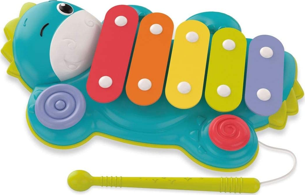 Roztomilý XyloDino je dokonalým společníkem při hře a vybízí dítě ke skládání sladkých a originálních melodií. Pomocí malé paličky na šňůrce může vaše dítě hrát na 5 barevných kláves. Hra stimuluje hudební vnímání a cit pro rytmus. Díky pískátku a otočnému talíři se rozvíjí zručnost těch nejmenších.Vlastnosti