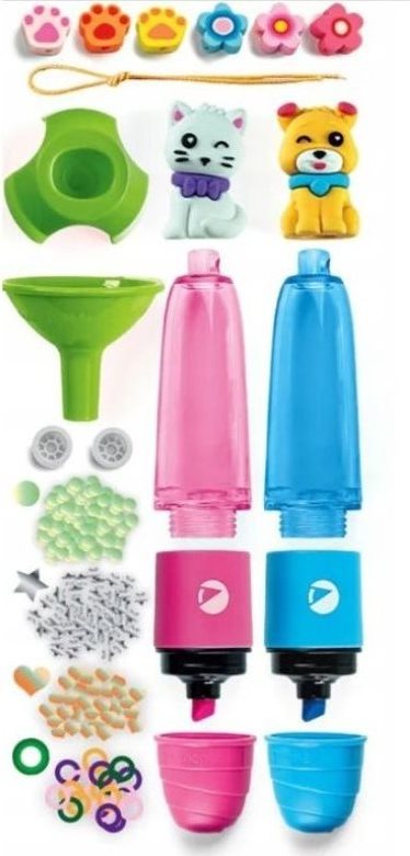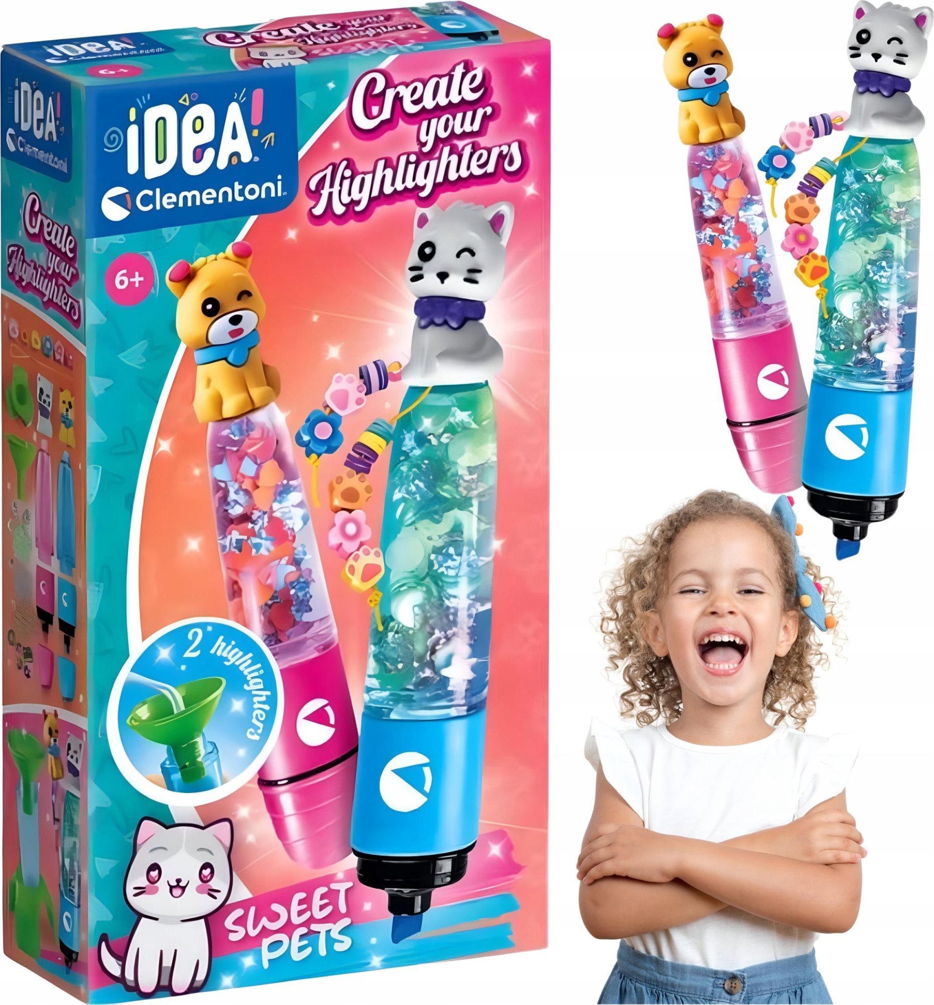 Originální kreativní sada z řady Clementoni IDEA! pro vytvoření zvýrazňovačů se spoustou ozdob a doplňků. Kreativní sada Clementoni Small Highlighter Lab – Sweet Pets, umožňující dítěti sestavit a personalizovat 2 zakrešlovače podle vlastního vkusu, ideální pro kreativní projevy.