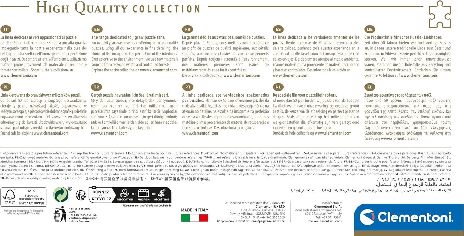 Puzzle v menší krabičce (compact box). Uvnitř balení je samostatná předloha skládaného motivu. Rozměr složeného puzzle cca 98 x 33 cmVlastnosti
