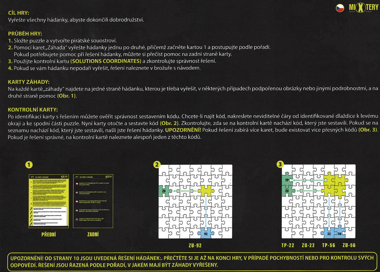 MIXTERY puzzle je tajemné puzzle skrývající několik hádanek. Po složení obrázku je třeba v hádankách najít vodítka a vyřešit je, abyste mohli pokračovat ve hře. Pátrejte jako skutečný detektiv a rozluštete záhadu této hry. Obsah balení: puzzle předloha skládaného motivu 12 kartiček s hádankami pokyny a řešení k hádankám návod CZ, SK, PL,HU, EN Rozměr složeného puzzle cca 49 x 36 cmVlastnosti