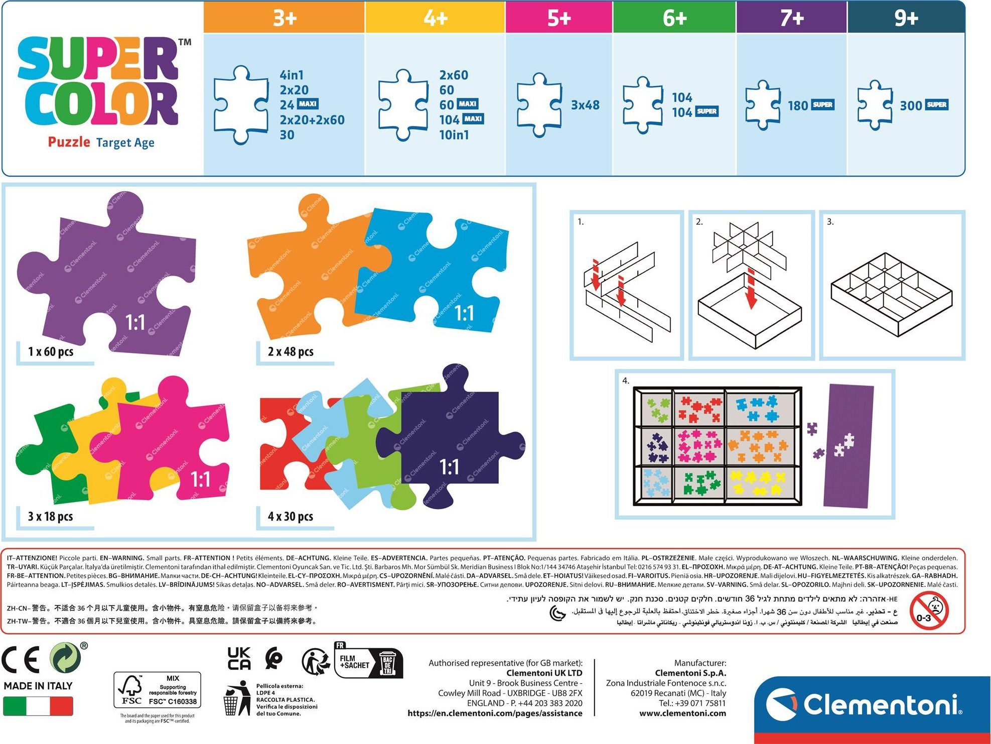 Krabice plná zábavy ukrývá hned několik dětských puzzle různé velikosti od 18 do 60 dílků. 10 puzzle v jednom balení různá obtížnost - počet dílků i jejich velikost (3 x 18 dílků, 4 x 30 dílků, 2 x 48 dílků, 1 x 60 dílků) roztomilá zvířátka rozvoj trpělivosti, motoriky i představivosti exkluzivní technika tisku Clementoni SuperColor zaručují trvale krásné a zářivé barvy ideální jako dárek