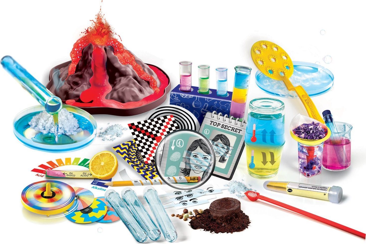 Obsah sady Kreativní box „Dětská laboratoř – 100 vědeckých experimentů“ (Clementoni)