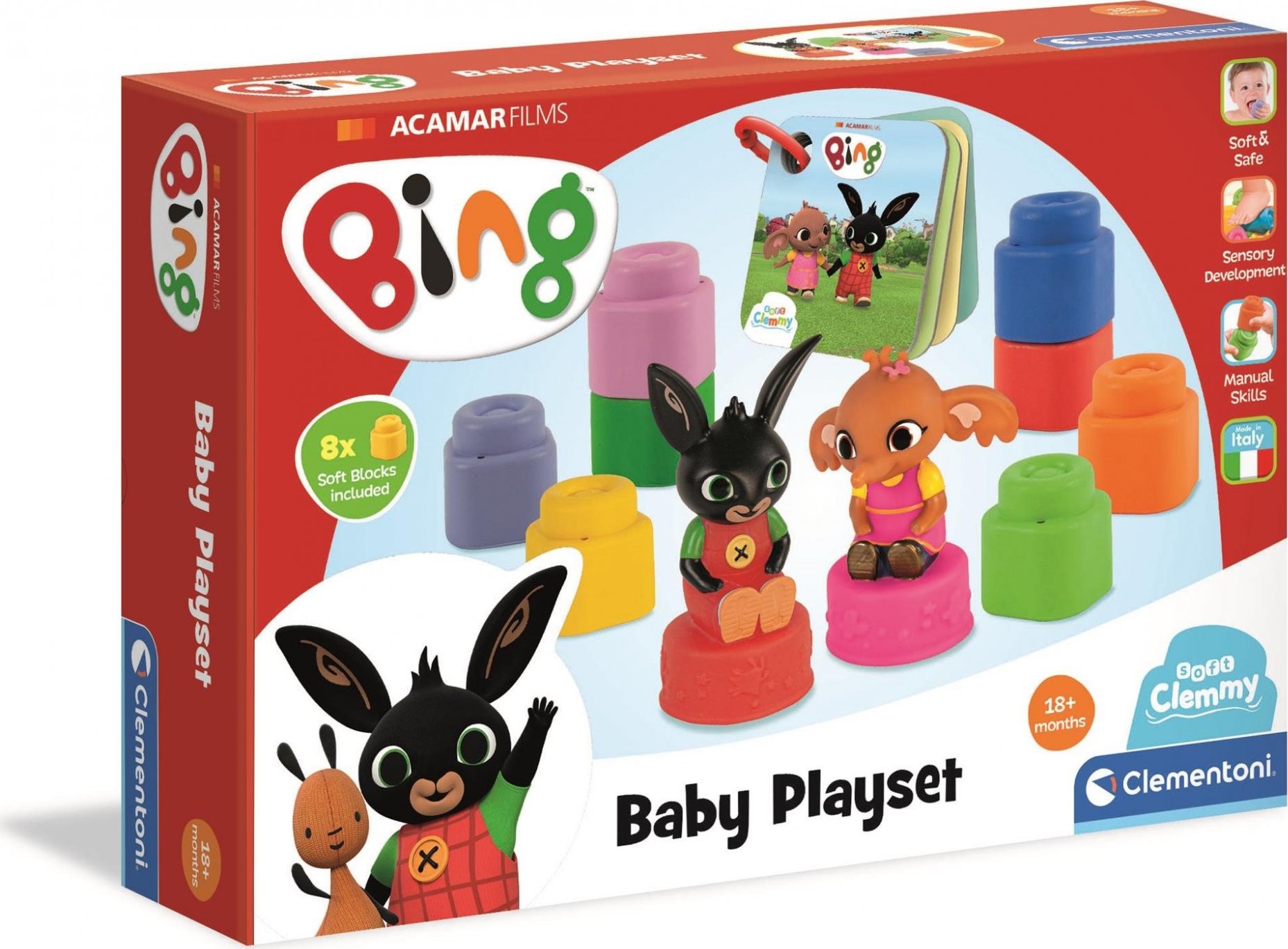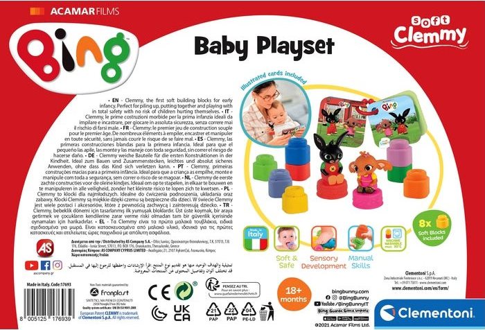 Zábavná sada určená pro malé děti, které si mohou hrát s přátelskými postavičkami Binga a Suly. Propojení příběhu s obrázky, vyprávěním a skládáním podporuje dětskou představivost, rozvíjí smyslové vnímání, manuální zručnost a prostorové vnímání, knížečka z pevného kartonu s Bingem a Sulou (10 x 10 x 1,5 cm) s kroužkem na zavěšení, 2 postavičky: Bing + Sula (lze nasadit na kostky), 8 měkkých CLEMMY kostek. POZNÁMKA: Kostky lze používat i při hraní ve vodě, dají se prát v pračce při max 30°C. Značka BABY CLEMENTONI je synonymem kreativity, nadšení a důrazu na kvalitu. Hračky pomáhají rodičům při komunikaci s dítětem. Vzhled hračky a její inovativní barvy, netoxické a pevné materiály, vytvarovaný povrch a různé funkce pomáhají při rozvoji hmatových a sluchových schopností, napomáhají pohybové aktivitě a vyvolávají první logické asociace. Z výrobků firmy jsou na českém trhu oblíbené zejména CLEMMY kostky, které jsou vyrobeny z měkké netoxické gumy. Ta je zároveň snadno omyvatelná a má lehkou vanilkovou vůni.Vlastnosti