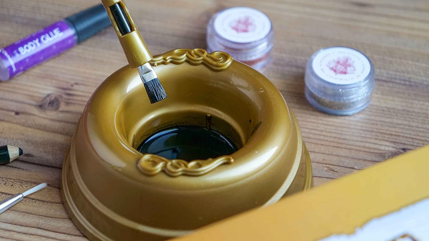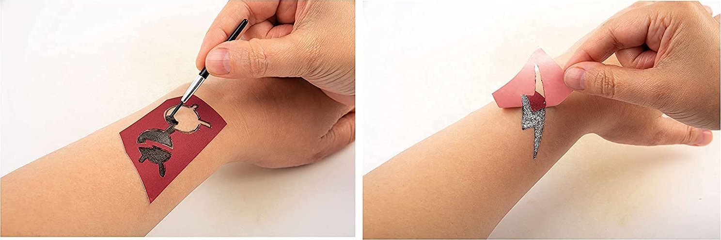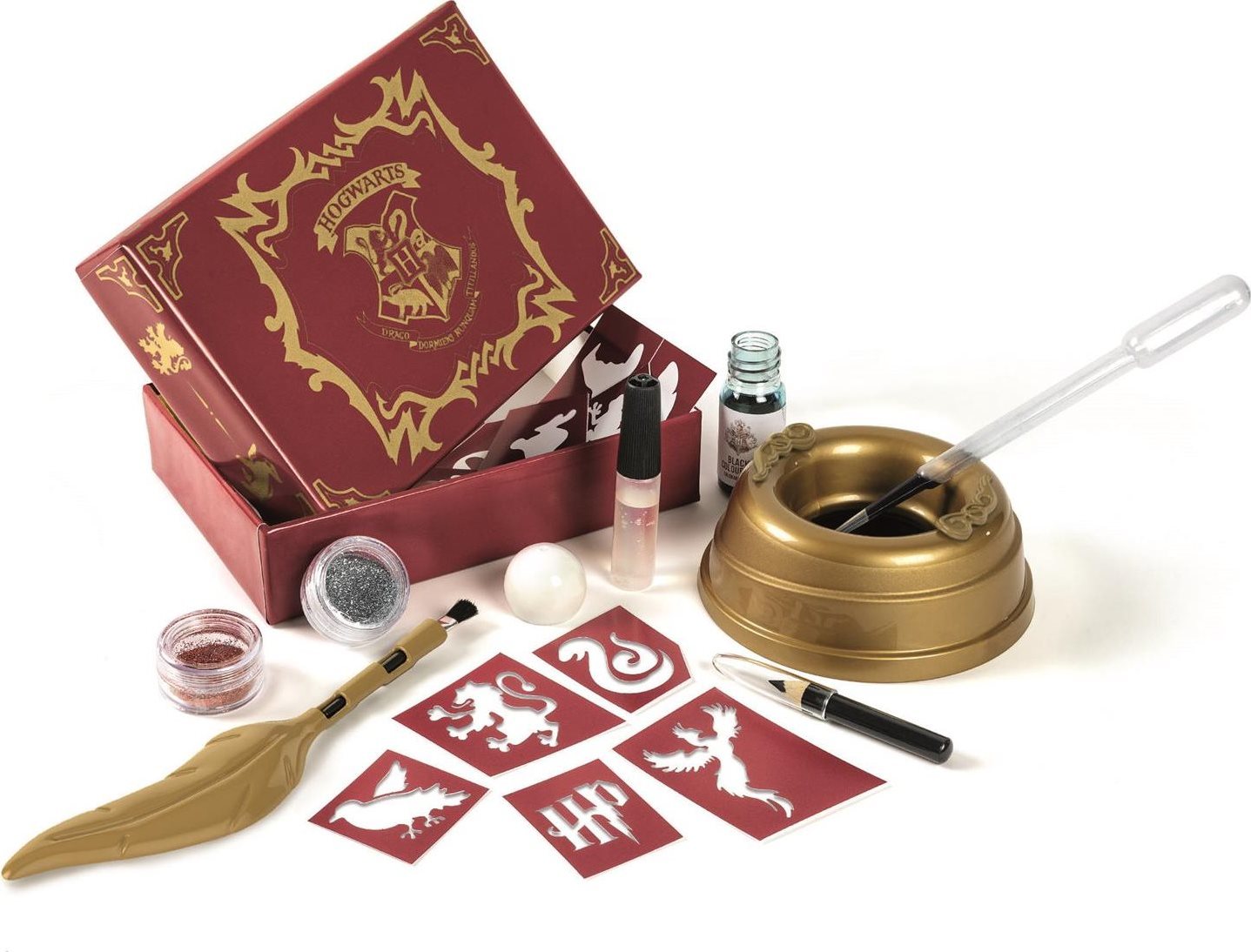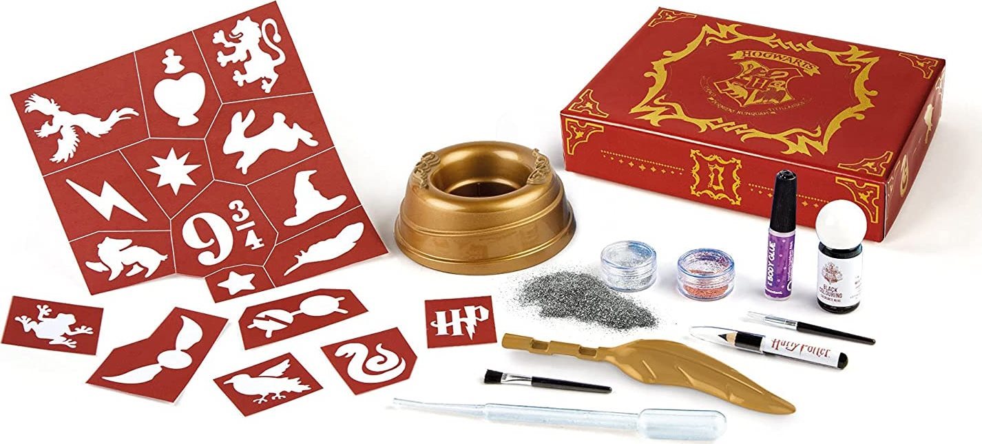 Zkrášli se fantastickým osobním tetováním ve stylu Harryho Pottera! třpytky, šablony, štětec a tužky pro vytvoření kouzelného tetování speciální aplikátor ve tvaru kouzelnického pírka je ideální pro připevnění třpytivého prachu na kůži praktická kazeta pro úložení tetovacího příslušenství Obsah balení: černá tekutá barva, barevné třptky, černá tužka, tenký štětec, široký štětec, šablony a nálepky, lepidlo na tělo, miska na barvu a ozdobné klipy, držák na štětec ve tvaru kouzelnického pírka, pipeta, krabička,kazeta, ilustrovaný návod.Vlastnosti