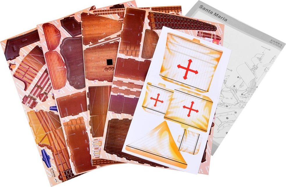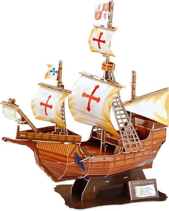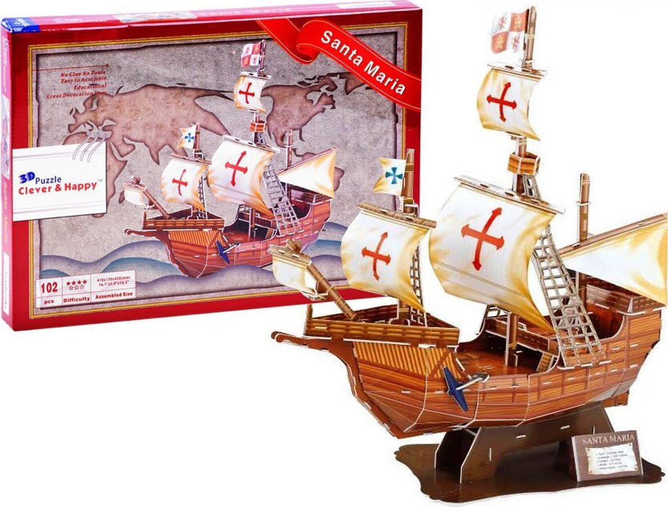 Zaoceánské dobrodružství připomíná velící loď Kryštofa Kolumba - karavela Santa Maria, největší ze tří lodí, se kterými se plavil r.1492 při své první cestě přes Atlantský oceán. Sada se skládá ze 72 dílků a obrázkové předlohy. Při sestavování procvičíte manuální dovednosti a přesnost. Ke složení nepotřebujete nůžky ani lepidlo . Rozměr složeného puzzle cca 41 x 15 x 42 cmVlastnosti