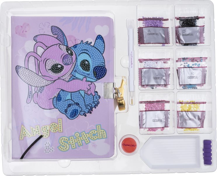 Kreativní sada pro ozdobení bloku s motivem Stitche pomocí kamínků. Diamantové malování je skvělý způsob relaxace , je to kreativní zábava pro každého . Pomocí aplikačního pera nanášíte kamínek za kamínkem na označená místa. V sadě najdete vše potřebné - blok se zámkem, klíče, pero, kamínky, misku, vosk, sáčky, grip na pero. Pro vytvoření dokonalého díla nejsou potřeba žádné umělecké schopnosti. Skvělý dárek pro každou příležitost.