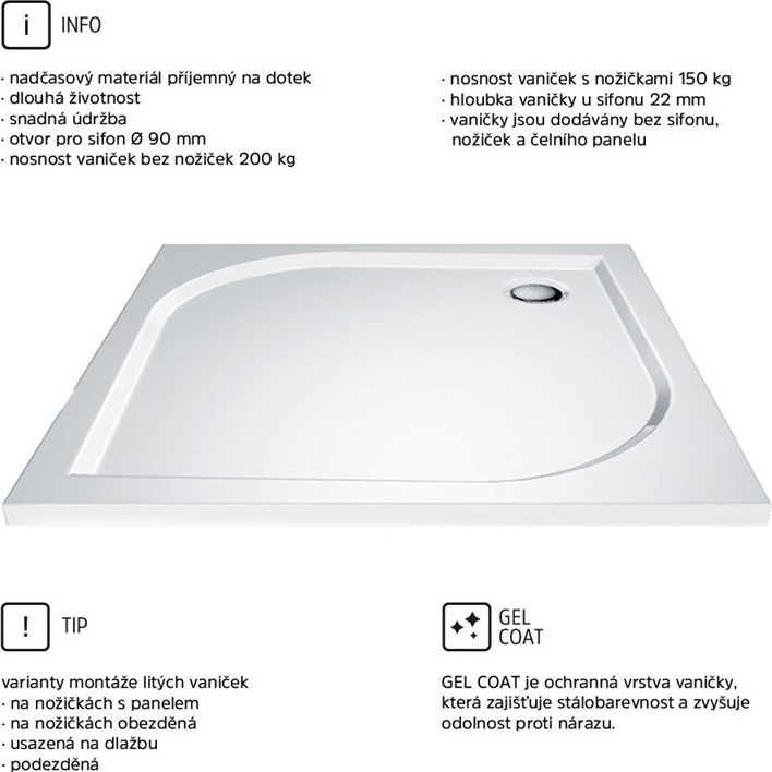 - otvor pro sifon ø 90 mm (sifon není součástí balení)