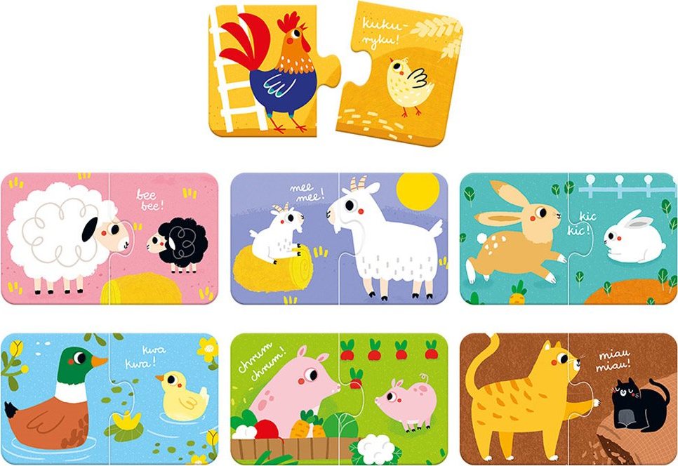 Farmářská zvířátka jsou puzzle navržené pro ty nejmenší. Zajímavé a barevné ilustrace upoutají pozornost dětí. Zkuste zjistit, zda vaše dítě dokáže najít dvojice z rozhozených dílků puzzle! Hledání a spojování polovin učí dítě zlepšovat koordinaci oko-ruka. Puzzle také rozvíjejí manuální dovednosti a schopnost pozorování. Skvělá sada pro ty nejmenší.