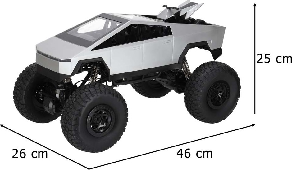 Seznamte se s RC modelem 1:8 Cyber Pickup Truck - výkonným dálkově ovládaným terénním modelem vytvořeným pro dynamickou jízdu a překonávání překážek. Díky pohonu všech kol (4WD), odpružení a velkým pneumatikám TPR o průměru 14 cm si vozidlo poradí i s náročným terénem a kopci se sklonem až 45°. Model pracuje na frekvenci 2,4 GHz, což zajišťuje stabilní spojenís dálkovým ovládáním s dosahem až 25 metrů. Je vybaven světelnými efekty, které mu při hře dodávají na realističnosti. Baterie s napětím 7,4 V umožňuje přibližně 20 minut jízdy. Díky velkému měřítku 1:8 (délka 45 cm) a robustní plastové konstrukci vypadá auto působivě a vydrží i intenzivní používání. Součástí sady je takémenší auto, které je ideální pro hru v interiéru.