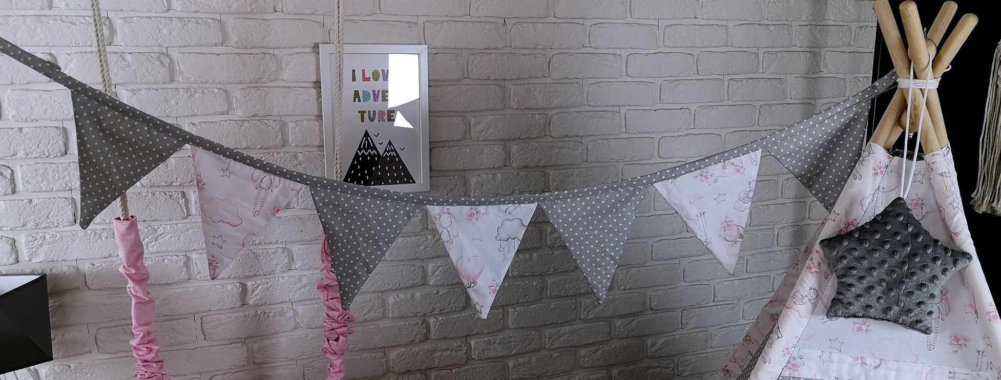 Jako doplněk nabízíme dvoubarevnou girlandu se sedmi praporky, která celý komplet Teepee (Týpí) stanu přivede k dokonalosti a oživí Váš interiér. Girlanda je vyrobená z kvalitní bavlny, která je velmi příjemná na dotek. Praporky neobsahují výplň.