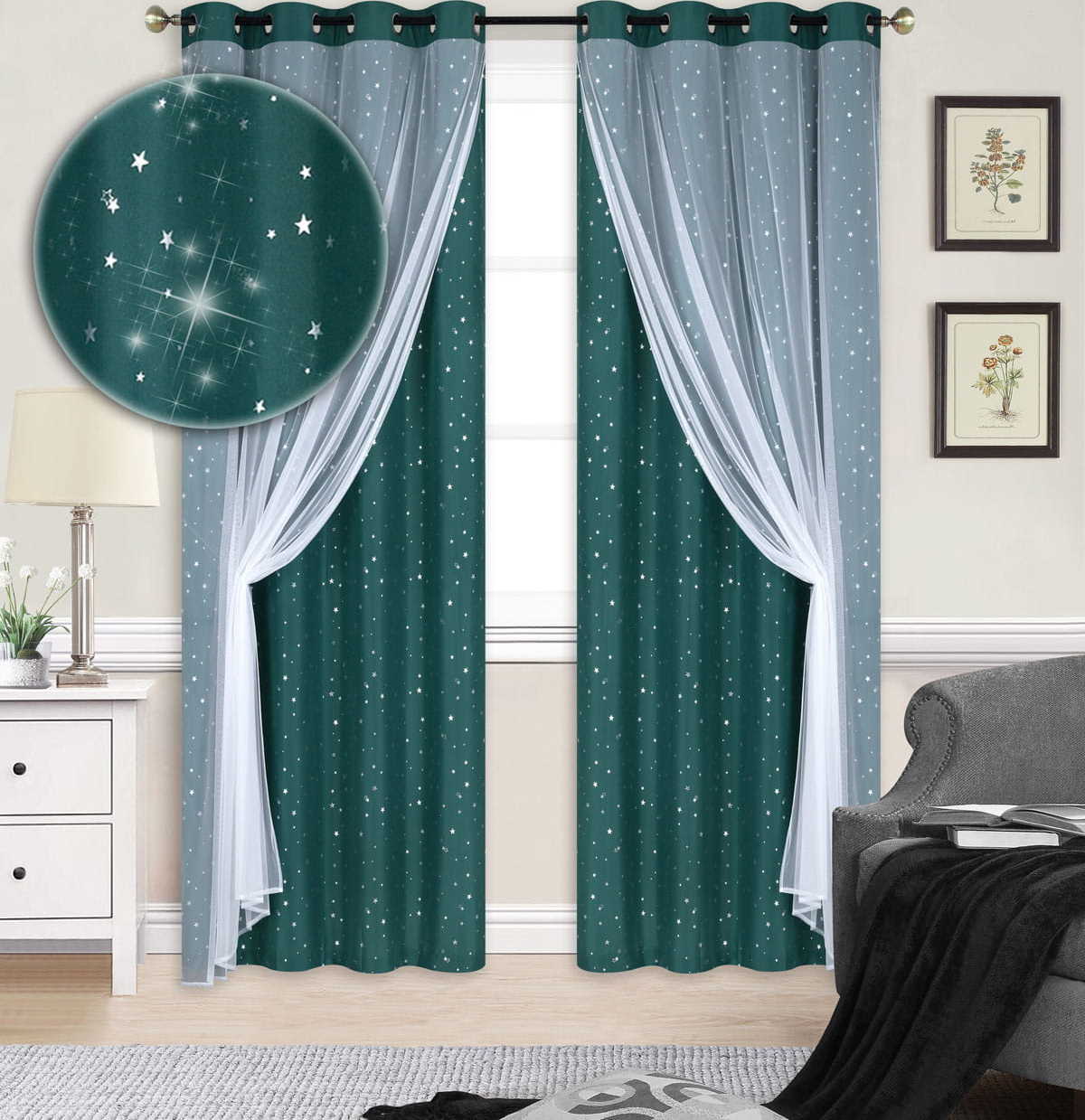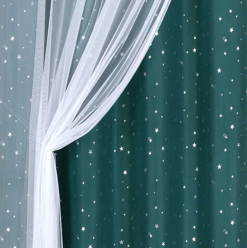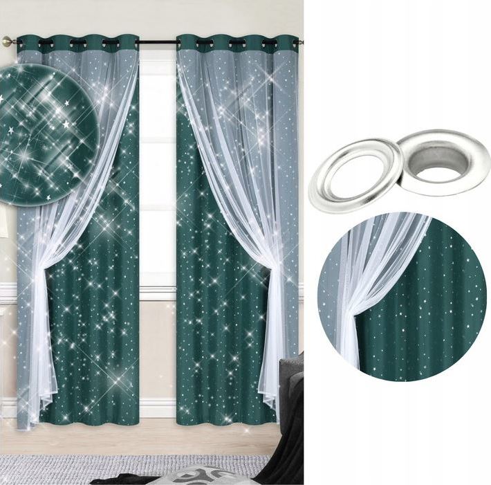 Nádherný dekorační dvouvrstvý závěs 2v1 oživí každý interiér. Závěs se skládá ze dvou částí - první vnitřní část tvoří hladká, matná barevná látka s hustou vazbou. Vnější stranu tvoří kvalitní bílá hladká záclona. Barevný závěs je navíc zdoben potiskem drobných hvězdiček, čímž získává romantický vzled. Použitý materiál na závěsy je polozatemňovací, propustí sluneční paprsky v malém množství, ale místnost stoprocentně nezatemní. Díky vhodně zvoleným barevným doplňkům snadno změníte ráz svého pokoje, závěs dodá eleganci a originální vzhled každé místnosti. Bude krásně vypadat v obývacím pokoji, jídelně ložnici a také v dětském pokoji.