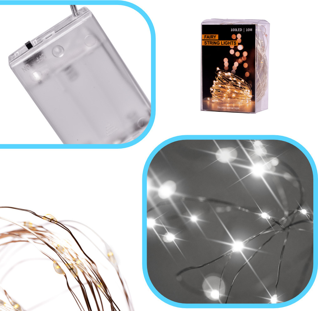 Unikátní dekorativní světla s velkým počtem diod (100 LED) na drátu dodají třpyt každému interiéru a přinesou vánoční kouzlo. Díky svému studenému bílému odstínu vypadají LED světla krásně v každé místnosti a vytvářejí útulnou a příjemnou atmosféru k relaxaci za zimních večerů. 100 světel na 10 metrech kabelu ozdobí váš pokoj a osvětlí vaše vánoční dekorace. Tenký drát usnadňuje schování v jehličí, což dodá vašemu vánočnímu stromečku magický vzhled. Světla jsou na baterie, takže je lze snadno zapnout kdekoli. Nejste omezeni žádnými kabely ani zásuvkami!