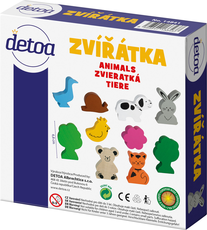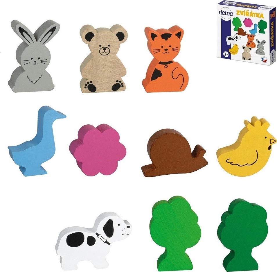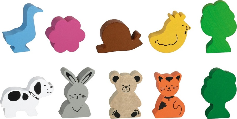Kočka, medvídek, zajíček, kuřátko, pejsek, husa, šneček, kytička a 2 stromy. Seznamte se s roztomilou sadou dřevěných zvířátek, která přináší zábavu a rozvíjí fantazii. Každé zvířátko je pečlivě vyrobeno z kvalitního materiálu a nabízí roztomilé detaily, které podporují kreativní hru. Děti si mohou vytvářet vlastní příběhy, naučí se rozpoznávat a pojmenovat zvířátka a barvy a procvičí si také jemnou motoriku a koordinaci ruka-oko. Sada je ideální pro společné hraní a rozvíjí představivost. Zvířátka jsou odolná, bezpečná a skvěle doplní každý dětský pokoj či hernu.