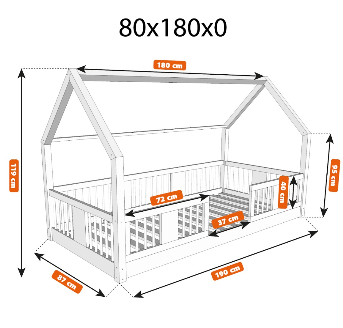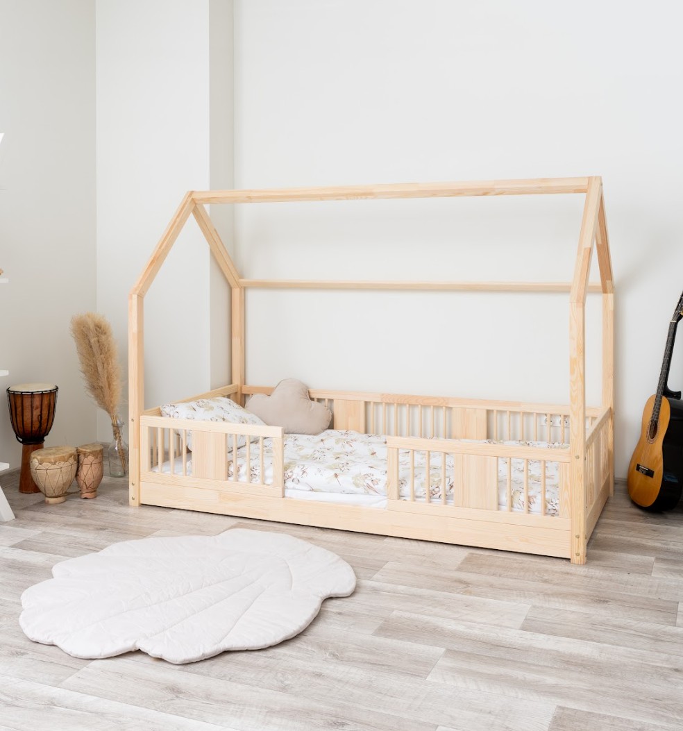 Montessori postel LUNA L je nízká dětská postel ve tvaru domečku určená pro nejmenší, kteří teprve začínají své dobrodružství se samostatným spánkem. Její rám, umístěný přímo na podlaze, minimalizuje riziko pádu a zároveň dává dítěti pocit nezávislosti a bezpečí. Tato jednolůžková postel vytváří harmonický prostor pro klidný spánek, první hraní a chvíle strávené s rodiči při čtení pohádek. Princip Montessori klade důraz na volnost dítěte, což tato postel nabízí. Je to perfektní volba pro rodiče, kteří hledají první postel pro své dítě, kombinující estetiku, odolnost a bezpečnost v duchu stylu Montessori. Postel LUNA je vyrobena z přírodního, lepeného borovicového dřeva – materiálu, který do každé místnosti vnáší teplo, svěžest a klid. Pro povrchovou úpravu byly použity ekologické barvy na vodní bázi, které splňují bezpečnostní normy. Postel nabízíme také ve verzi bez povrchových úprav - nelakované dřevo. Díky tomu ji lze snadno přizpůsobit - její vzhled můžete upravit mořením, lakováním nebo malováním dle vlastního uvážení. Výrazné kulaté lamely dodávají posteli lehký a příjemný pocit. Jejich měkký tvar činí postel decentní a elegantní a zároveň zůstává zcela bezpečná pro nejmladší uživatele. Dlouhá dřevěná nebesa typu LONG dodává posteli jedinečný, pohádkový nádech. Jejich protáhlý tvar vytváří dojem útulné chaloupky, kde děti nejen spí, ale také si vymýšlejí vlastní hry a příběhy. Je to ideální místo pro jejich fantazii – jen pár polštářů, nebesa nebo několik lampiček dokáže proměnit postel v kouzelný dětský koutek. Každý prvek rámu byl precizně vyleštěn a hrany jsou jemně zaoblené, aby bylo zajištěno maximální pohodlí a bezpečnost. Bezpečnostní zábrany u vstupu do postele jsou odnímatelné.