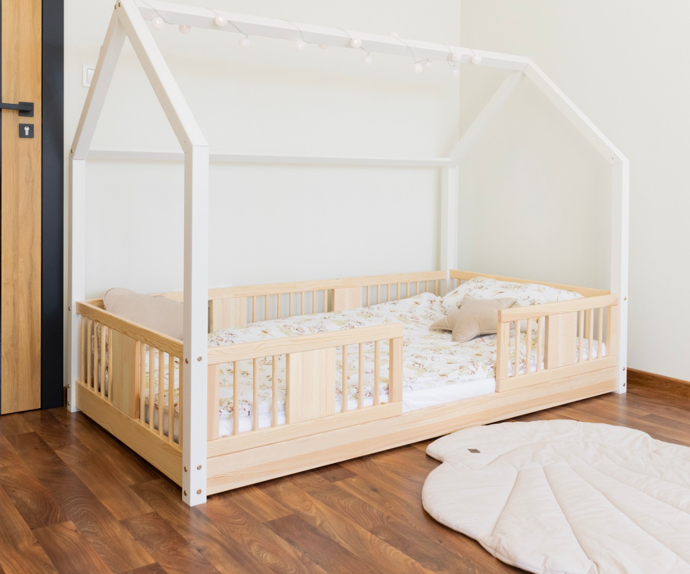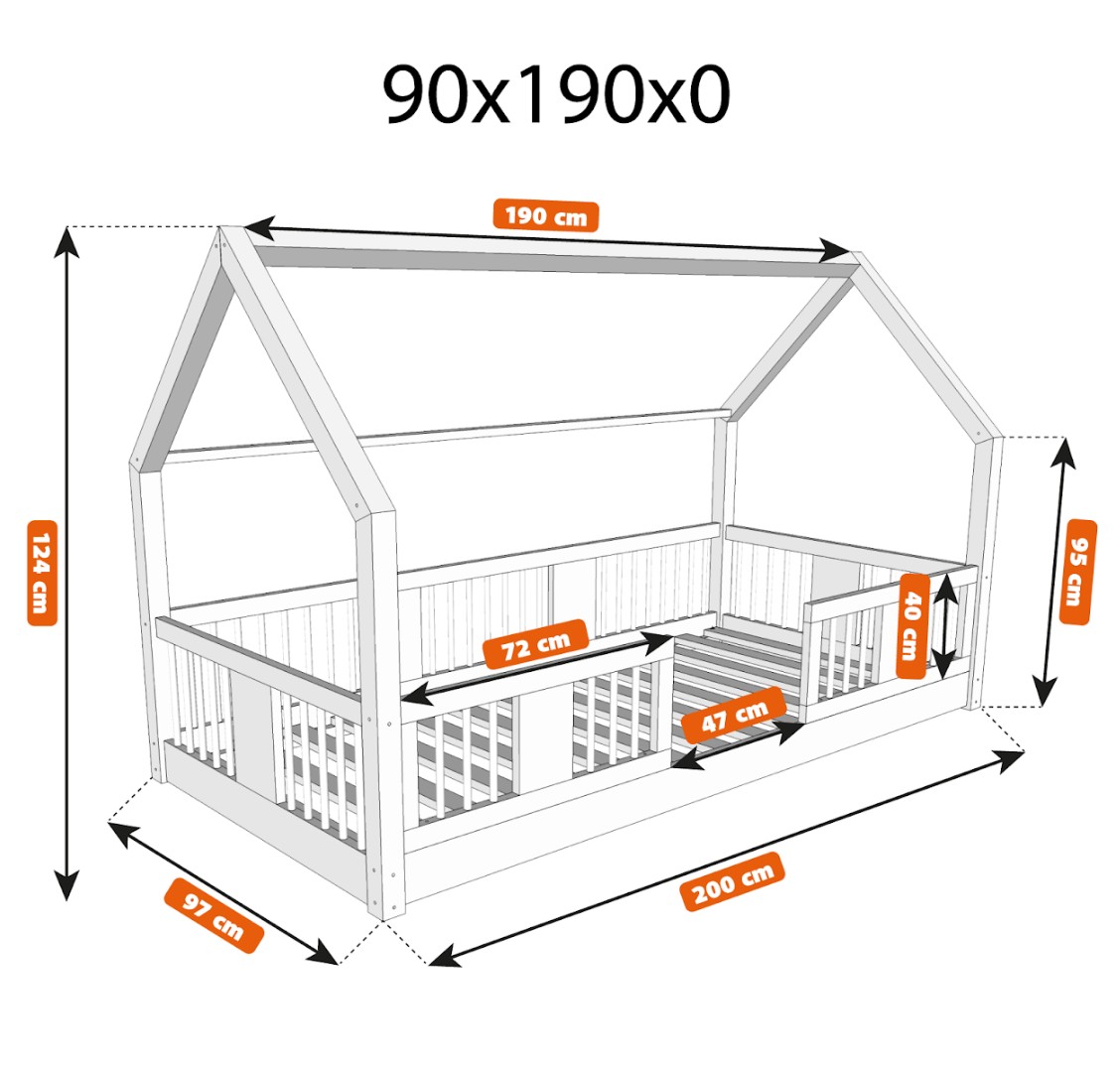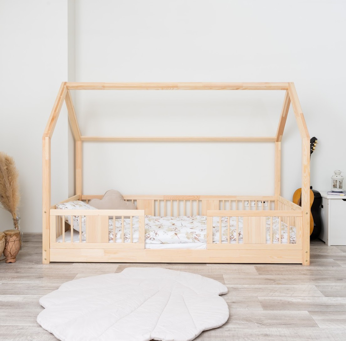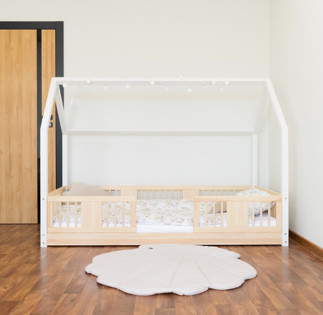 Montessori postel LUNA L je nízká dětská postel ve tvaru domečku určená pro nejmenší, kteří teprve začínají své dobrodružství se samostatným spánkem. Její rám, umístěný přímo na podlaze, minimalizuje riziko pádu a zároveň dává dítěti pocit nezávislosti a bezpečí. Tato jednolůžková postel vytváří harmonický prostor pro klidný spánek, první hraní a chvíle strávené s rodiči při čtení pohádek. Princip Montessori klade důraz na volnost dítěte, což tato postel nabízí. Je to perfektní volba pro rodiče, kteří hledají první postel pro své dítě, kombinující estetiku, odolnost a bezpečnost v duchu stylu Montessori. Postel LUNA je vyrobena z přírodního, lepeného borovicového dřeva – materiálu, který do každé místnosti vnáší teplo, svěžest a klid. Pro povrchovou úpravu byly použity ekologické barvy na vodní bázi, které splňují bezpečnostní normy. Postel nabízíme také ve verzi bez povrchových úprav - nelakované dřevo. Díky tomu ji lze snadno přizpůsobit - její vzhled můžete upravit mořením, lakováním nebo malováním dle vlastního uvážení. Výrazné kulaté lamely dodávají posteli lehký a příjemný pocit. Jejich měkký tvar činí postel decentní a elegantní a zároveň zůstává zcela bezpečná pro nejmladší uživatele. Dlouhá dřevěná nebesa typu LONG dodává posteli jedinečný, pohádkový nádech. Jejich protáhlý tvar vytváří dojem útulné chaloupky, kde děti nejen spí, ale také si vymýšlejí vlastní hry a příběhy. Je to ideální místo pro jejich fantazii – jen pár polštářů, nebesa nebo několik lampiček dokáže proměnit postel v kouzelný dětský koutek. Každý prvek rámu byl precizně vyleštěn a hrany jsou jemně zaoblené, aby bylo zajištěno maximální pohodlí a bezpečnost. Bezpečnostní zábrany u vstupu do postele jsou odnímatelné.