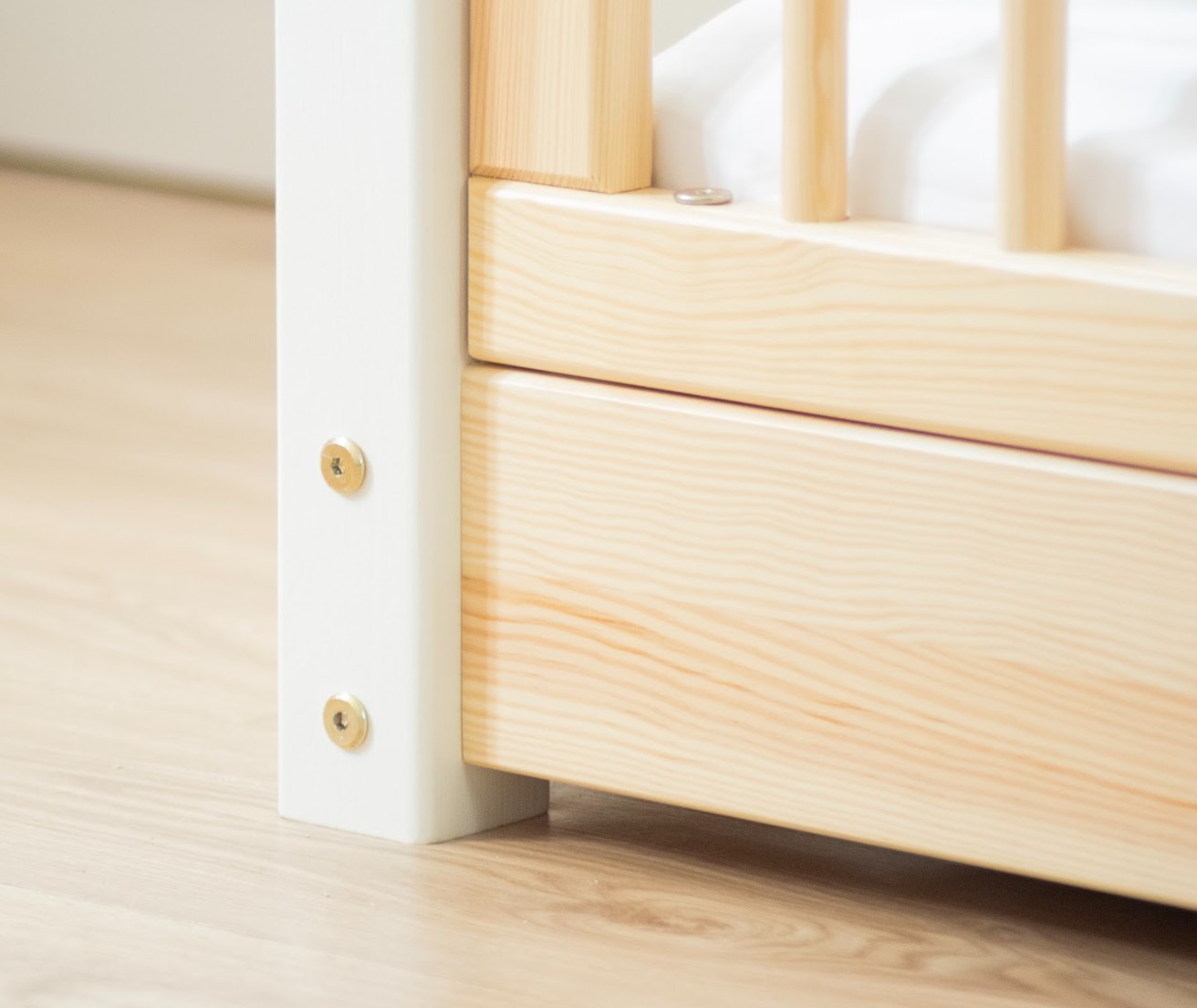 Montessori postel LUNA S je okouzlující jednolůžko ve tvaru domečku, které kombinuje funkčnost, bezpečnost a nadčasovou estetiku. Postaveno přímo na podlahu vytváří bezpečný prostor, ideální jako první dětská postýlka. Díky nízkému profilu může vaše dítě samostatně vlézt a vstávat z postele, což podporuje jeho vývoj a nezávislost od útlého věku. Princip Montessori klade důraz na volnost dítěte, což tato postel nabízí. Charakteristickým rysem modelu LUNA jsou kulaté, soustružené příčky, které dodávají posteli jemný, příjemný vzhled a nenápadně ji odlišují od ostatních modelů. Jejich měkký tvar vnáší do interiéru harmonii a lehkost a zároveň poskytuje dodatečné bezpečí během spánku. Postel LUNA S je vyrobena výhradně z přírodního borovicového dřeva – odolného, přírodního a zcela bezpečného pro děti. Každý kus má zaoblené hrany pro pohodlné používání. Pro povrchovou úpravu byly použity ekologické barvy na vodní bázi, které splňují bezpečnostní normy. Postel nabízíme také ve verzi bez povrchových úprav - nelakované dřevo. Díky tomu ji lze snadno přizpůsobit - její vzhled můžete upravit mořením, lakováním nebo malováním dle vlastního uvážení. Unikátní dřevěný baldachýn vytváří útulnou, pohádkovou atmosféru. Stačí přidat světla nebo lehkou látku a proměnit obyčejný pokoj v kouzelný prostor. Tato postel není jen pro spaní, ale také pro vytváření vzpomínek.