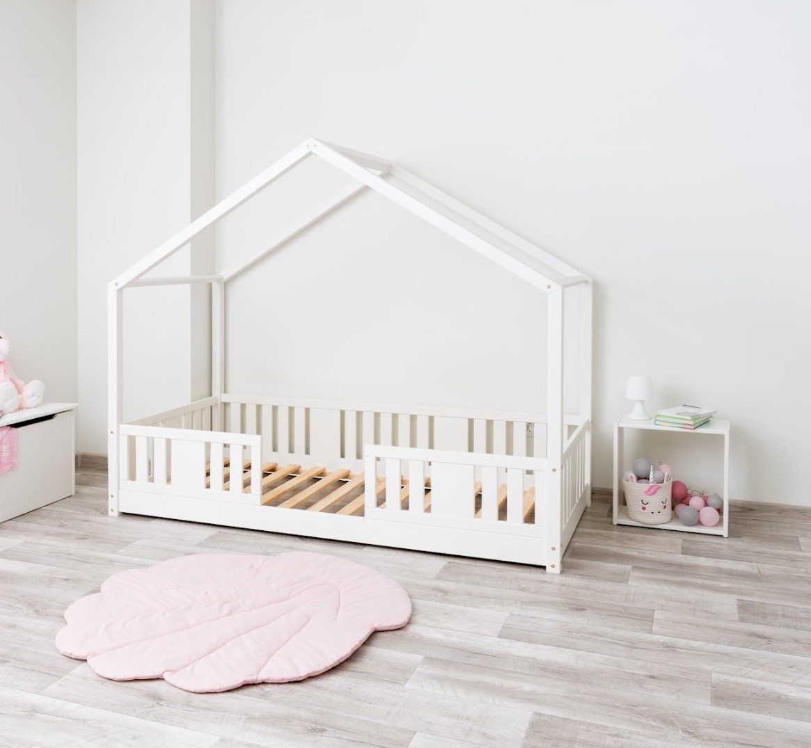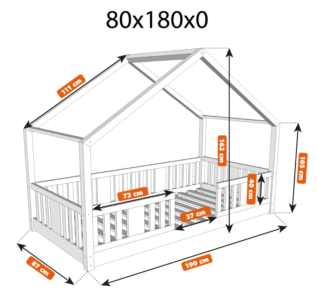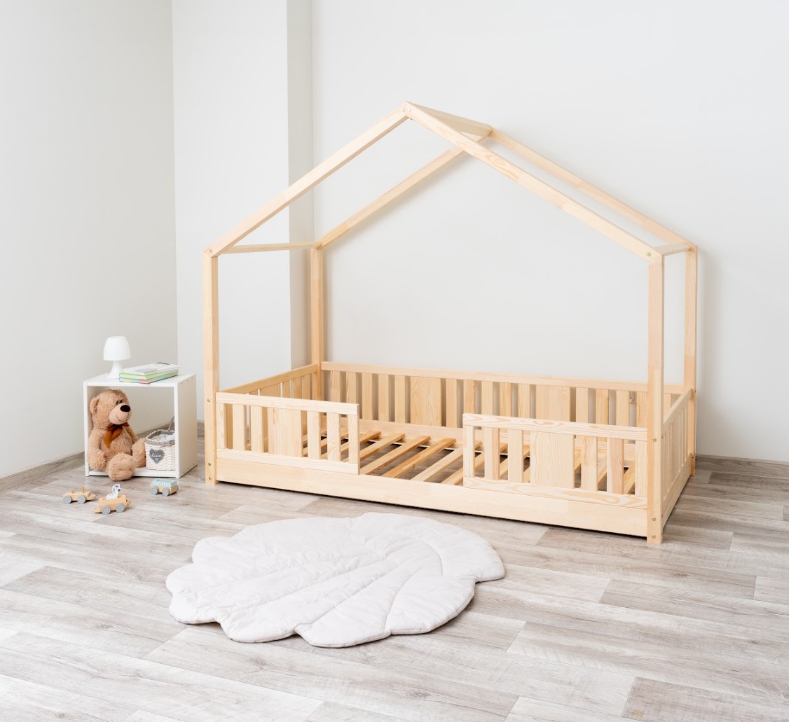 Montessori postel NIKO S je nízká dětská postel ve tvaru domečku, která v sobě spojuje funkčnost, bezpečnost a okouzlující design. Rám, umístěný přímo na podlaze, umožňuje vašemu dítěti samostatně vlézt do postele a z ní vylézat, což podporuje nezávislost a pocit bezpečí. Princip Montessori klade důraz na volnost dítěte, což tato postel nabízí. Charakteristický dřevěný baldachýn promění tuto klasickou jednolůžko v útulný domeček pro spaní a hraní. NIKO S kombinuje funkčnost s kouzlem dětství a nabízí bezpečné místo pro spánek a hraní v jednom. Postel je vyrobena výhradně z přírodního borovicového dřeva o síle 2,2 cm, ceněného pro svou odolnost, stabilitu a hřejivý vzhled. Dřevo bylo pečlivě broušeno a všechny hrany jsou jemně zaoblené, aby byla zajištěna maximální bezpečnost pro nejmladší uživatele. Celá konstrukce je povrchově upravena ekologickými barvami na vodní bázi, které splňují evropskou normu EN 71-3. Barvy jsou bez zápachu, netoxické a bezpečné i pro alergiky. Postel nabízíme také ve verzi bez povrchových úprav - nelakované dřevo. Díky tomu ji lze snadno přizpůsobit - její vzhled můžete upravit mořením, lakováním nebo malováním dle vlastního uvážení. Není to jen postel na spaní – je to malý dřevěný domeček, který rozvíjí dětskou fantazii a podporuje kreativní hru. Dřevěná stříška ve verzi SHORT vytváří jedinečně útulnou atmosféru, kterou lze snadno vylepšit světly, látkami nebo girlandami.