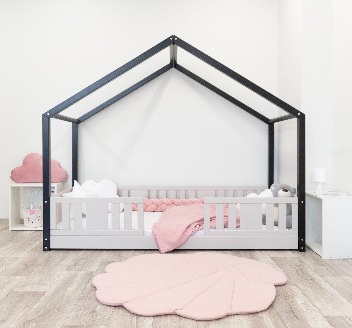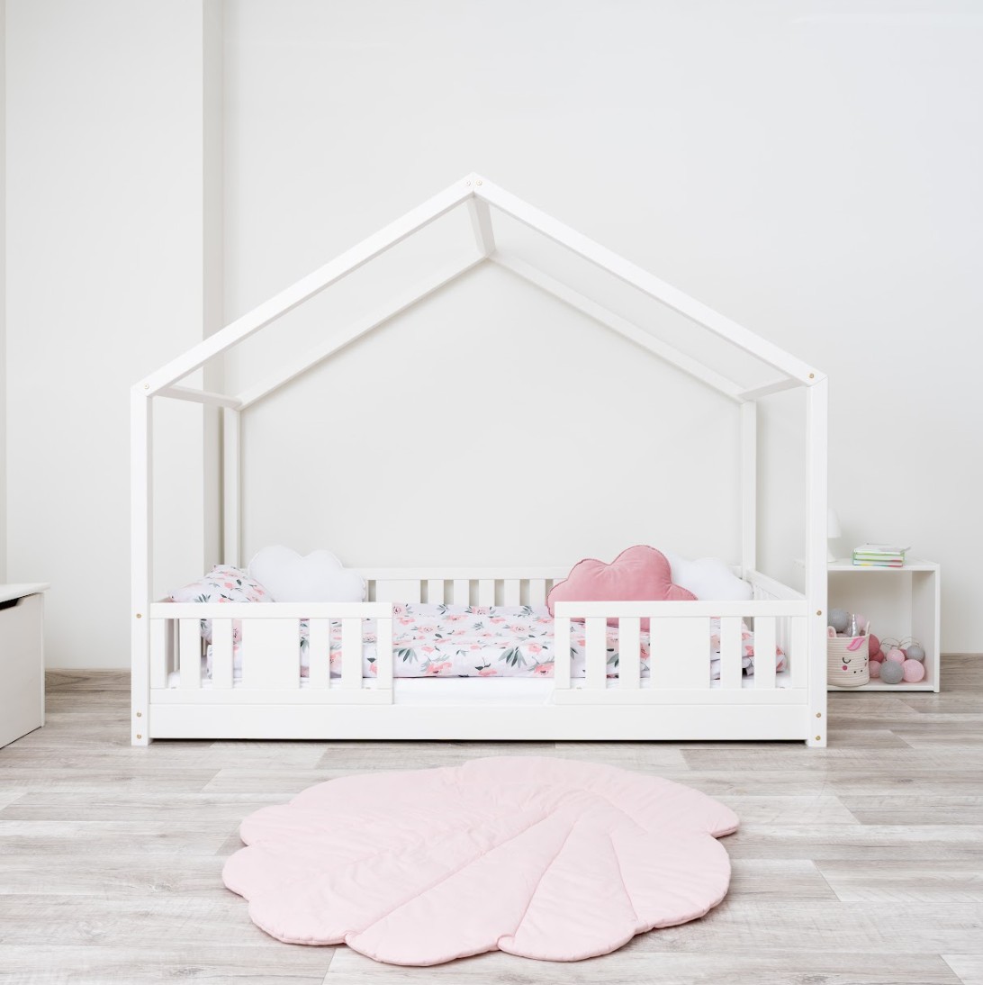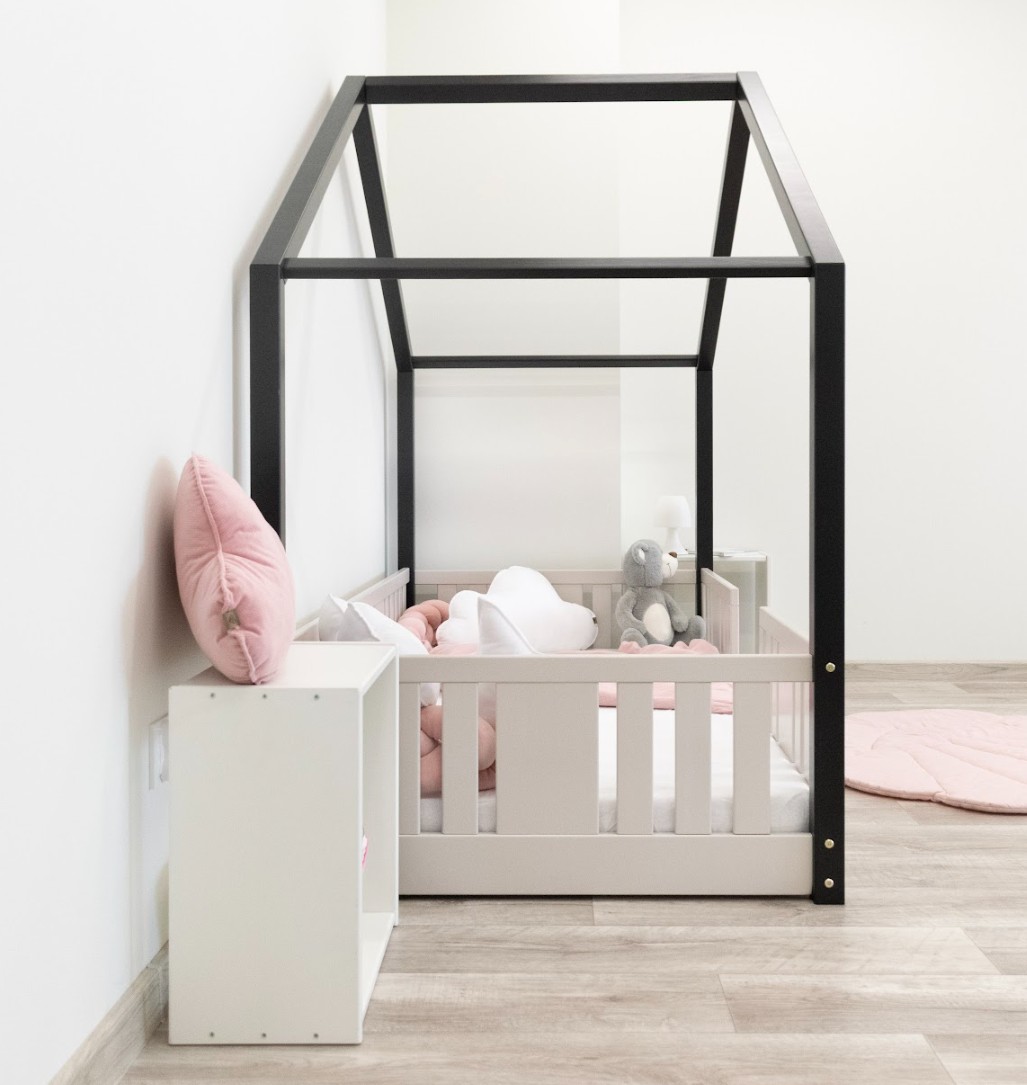 Montessori postel NIKO S je nízká dětská postel ve tvaru domečku, která v sobě spojuje funkčnost, bezpečnost a okouzlující design. Rám, umístěný přímo na podlaze, umožňuje vašemu dítěti samostatně vlézt do postele a z ní vylézat, což podporuje nezávislost a pocit bezpečí. Princip Montessori klade důraz na volnost dítěte, což tato postel nabízí. Charakteristický dřevěný baldachýn promění tuto klasickou jednolůžko v útulný domeček pro spaní a hraní. NIKO S kombinuje funkčnost s kouzlem dětství a nabízí bezpečné místo pro spánek a hraní v jednom. Postel je vyrobena výhradně z přírodního borovicového dřeva o síle 2,2 cm, ceněného pro svou odolnost, stabilitu a hřejivý vzhled. Dřevo bylo pečlivě broušeno a všechny hrany jsou jemně zaoblené, aby byla zajištěna maximální bezpečnost pro nejmladší uživatele. Celá konstrukce je povrchově upravena ekologickými barvami na vodní bázi, které splňují evropskou normu EN 71-3. Barvy jsou bez zápachu, netoxické a bezpečné i pro alergiky. Postel nabízíme také ve verzi bez povrchových úprav - nelakované dřevo. Díky tomu ji lze snadno přizpůsobit - její vzhled můžete upravit mořením, lakováním nebo malováním dle vlastního uvážení. Není to jen postel na spaní – je to malý dřevěný domeček, který rozvíjí dětskou fantazii a podporuje kreativní hru. Dřevěná stříška ve verzi SHORT vytváří jedinečně útulnou atmosféru, kterou lze snadno vylepšit světly, látkami nebo girlandami.