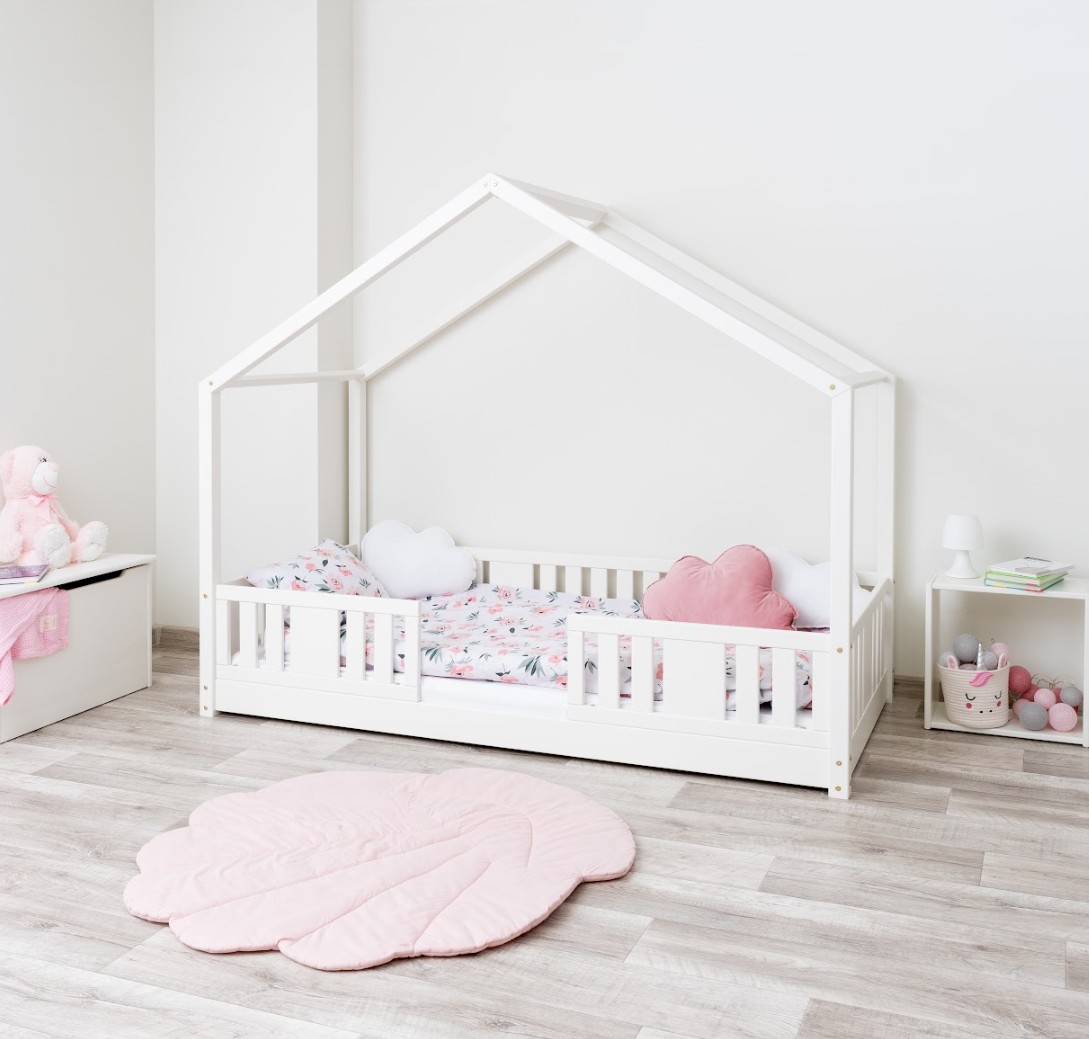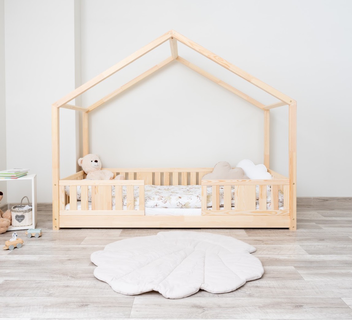 Montessori postel NIKO S je nízká dětská postel ve tvaru domečku, která v sobě spojuje funkčnost, bezpečnost a okouzlující design. Rám, umístěný přímo na podlaze, umožňuje vašemu dítěti samostatně vlézt do postele a z ní vylézat, což podporuje nezávislost a pocit bezpečí. Princip Montessori klade důraz na volnost dítěte, což tato postel nabízí. Charakteristický dřevěný baldachýn promění tuto klasickou jednolůžko v útulný domeček pro spaní a hraní. NIKO S kombinuje funkčnost s kouzlem dětství a nabízí bezpečné místo pro spánek a hraní v jednom. Postel je vyrobena výhradně z přírodního borovicového dřeva o síle 2,2 cm, ceněného pro svou odolnost, stabilitu a hřejivý vzhled. Dřevo bylo pečlivě broušeno a všechny hrany jsou jemně zaoblené, aby byla zajištěna maximální bezpečnost pro nejmladší uživatele. Celá konstrukce je povrchově upravena ekologickými barvami na vodní bázi, které splňují evropskou normu EN 71-3. Barvy jsou bez zápachu, netoxické a bezpečné i pro alergiky. Postel nabízíme také ve verzi bez povrchových úprav - nelakované dřevo. Díky tomu ji lze snadno přizpůsobit - její vzhled můžete upravit mořením, lakováním nebo malováním dle vlastního uvážení. Není to jen postel na spaní – je to malý dřevěný domeček, který rozvíjí dětskou fantazii a podporuje kreativní hru. Dřevěná stříška ve verzi SHORT vytváří jedinečně útulnou atmosféru, kterou lze snadno vylepšit světly, látkami nebo girlandami.