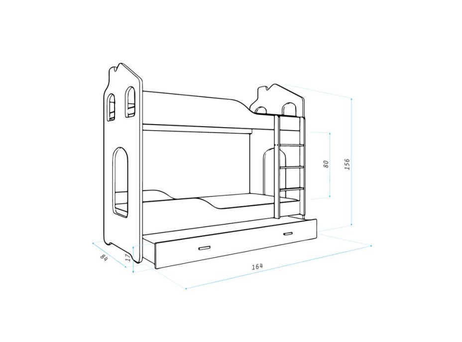 Dětská domečková patrová postel Dominik s dvojlůžkem ušetří prostor v dětském pokoji!Tato postel se šuplíkem je vyrobena z pevných MDF desek, které jsou stabilní a velmi praktické díky své snadné údržbě. Celá postel je ošetřena bezbarvým a bezzápachovým lakem, který je ekologický a bezpečný pro děti. Konstrukce postele je vyrobena tak, aby zabránila pádu dítěte, ochranné zábrany zajistí bezpečný a klidný spánek. Součástí této postele jsou také kvalitní dřevěné flex rošty a žebřík, který při první instalaci můžete upevnit vpravo nebo vlevo. Velkou výhodou postele je prostorný šuplík na kolečkách, do kterého děti mohou uschovávat své věci.