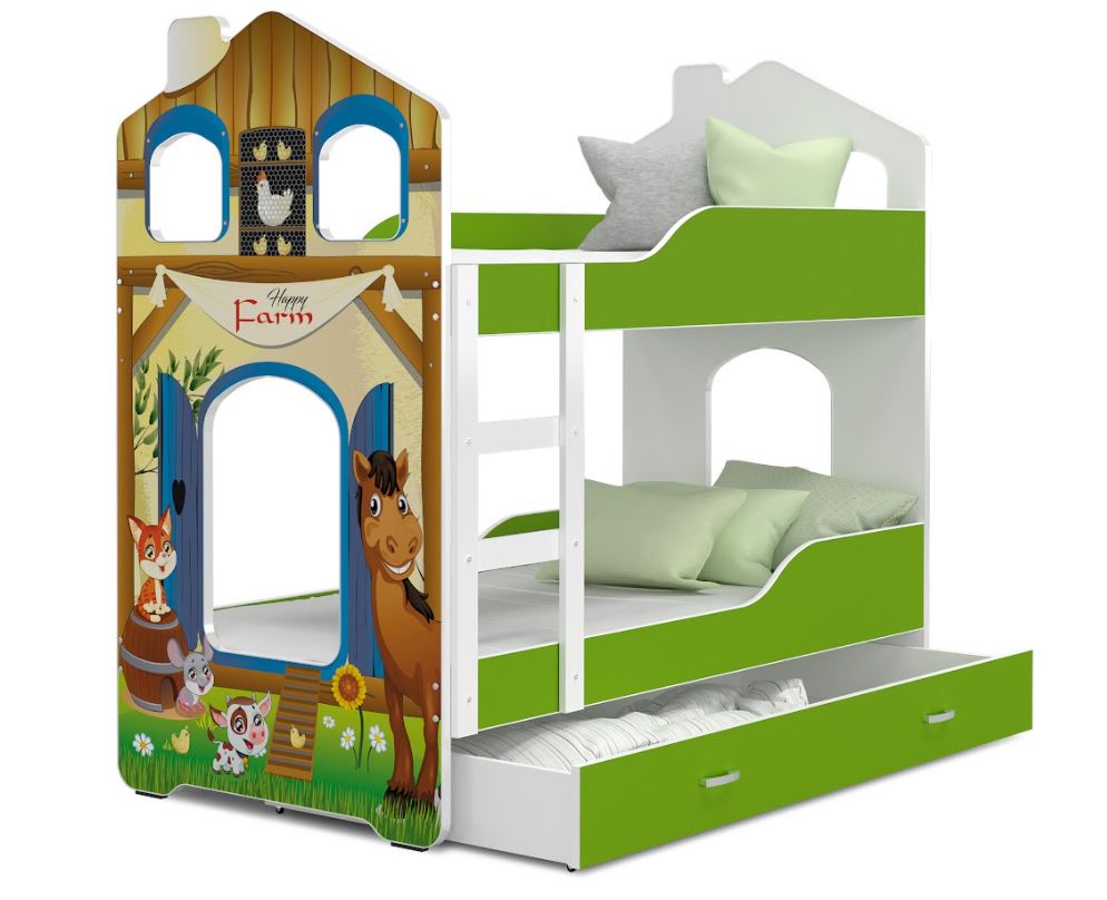 Dětská domečková patrová postel Dominik s dvojlůžkem ušetří prostor v dětském pokoji!Tato postel se šuplíkem je vyrobena z pevných MDF desek, které jsou stabilní a velmi praktické díky své snadné údržbě. Celá postel je ošetřena bezbarvým a bezzápachovým lakem, který je ekologický a bezpečný pro děti. Konstrukce postele je vyrobena tak, aby zabránila pádu dítěte, ochranné zábrany zajistí bezpečný a klidný spánek. Součástí této postele jsou také kvalitní dřevěné flex rošty a žebřík, který při první instalaci můžete upevnit vpravo nebo vlevo. Velkou výhodou postele je prostorný šuplík na kolečkách, do kterého děti mohou uschovávat své věci.