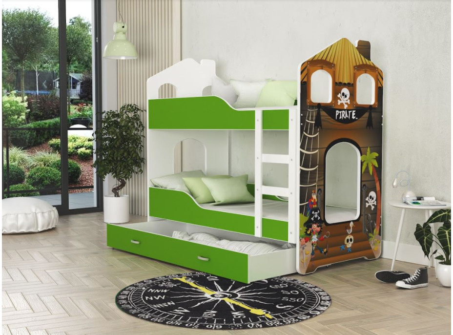 Dětská domečková patrová postel Dominik s dvojlůžkem ušetří prostor v dětském pokoji!Tato postel se šuplíkem je vyrobena z pevných MDF desek, které jsou stabilní a velmi praktické díky své snadné údržbě. Celá postel je ošetřena bezbarvým a bezzápachovým lakem, který je ekologický a bezpečný pro děti. Konstrukce postele je vyrobena tak, aby zabránila pádu dítěte, ochranné zábrany zajistí bezpečný a klidný spánek. Součástí této postele jsou také kvalitní dřevěné flex rošty a žebřík, který při první instalaci můžete upevnit vpravo nebo vlevo. Velkou výhodou postele je prostorný šuplík na kolečkách, do kterého děti mohou uschovávat své věci.
