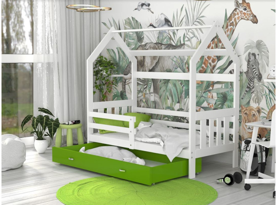 Dětská domečková postel z pevného borovicového dřeva se stane krásným designovým prvkem v každém moderním pokoji. Konstrukce postele má ochrannou bariéru a vaše dítě se tak bude cítit bezpečně. Ochranná bariéra lze připevnit na pravou nebo levou stranu. Součástí této postele je také velký prostorný šuplík na kolečkách vyrobený z vysoce kvalitních lamino desek, do kterého si vaše dítě bude moct uschovávat své věci. Na tuto postel byl použit bezbarvý a bezzápachový lak, který je bezpečný a ekologický.
