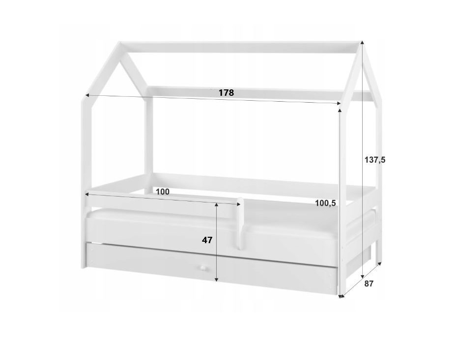 Dětská domečková postel LITTLE HOUSE patří mezi oblíbené vzory postelí ve tvaru domku. Díky své neutrální barvě se hodí do chlapeckých i dívčích pokojů. Rám postele je vyroben z MDF desek a dřevotřískových desek o síle 16 mm, díky čemuž je postel pevná a stabilní. O bezpečí dětí během spánku se postará ochranná bariérka, kterou lze namontovat na pravou i levou stranu. Postel je dodávána včetně flexibilního lamelového roštu uchyceného systémem click-clack, čímž je usnadněna jeho montáž. Postel má také praktický šuplík na kolečkách pro uložení lůžkovin.