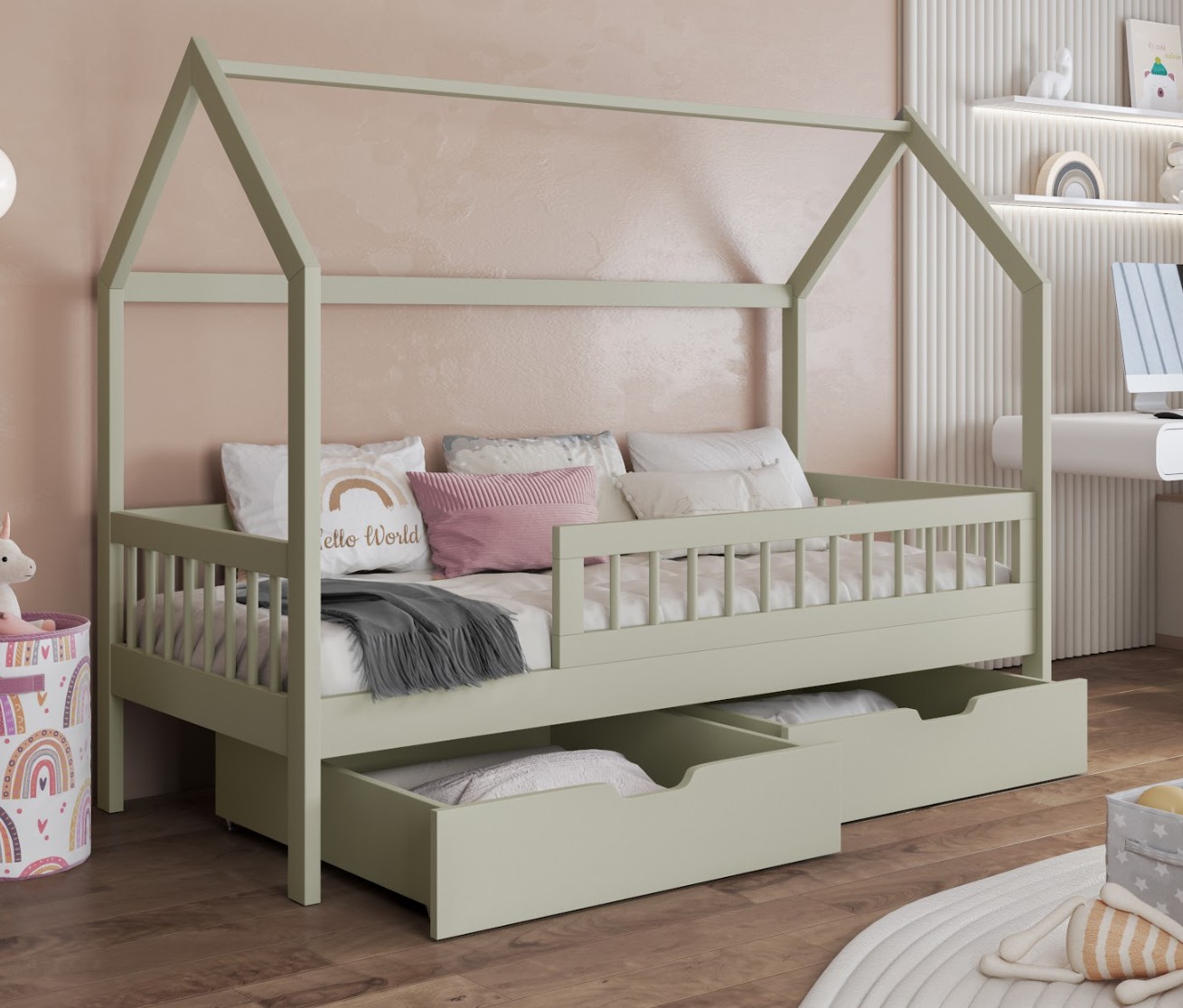 Dětská domečková postel z masivu borovice se šuplíky GAJA - 140x70 cm - olivově zelená