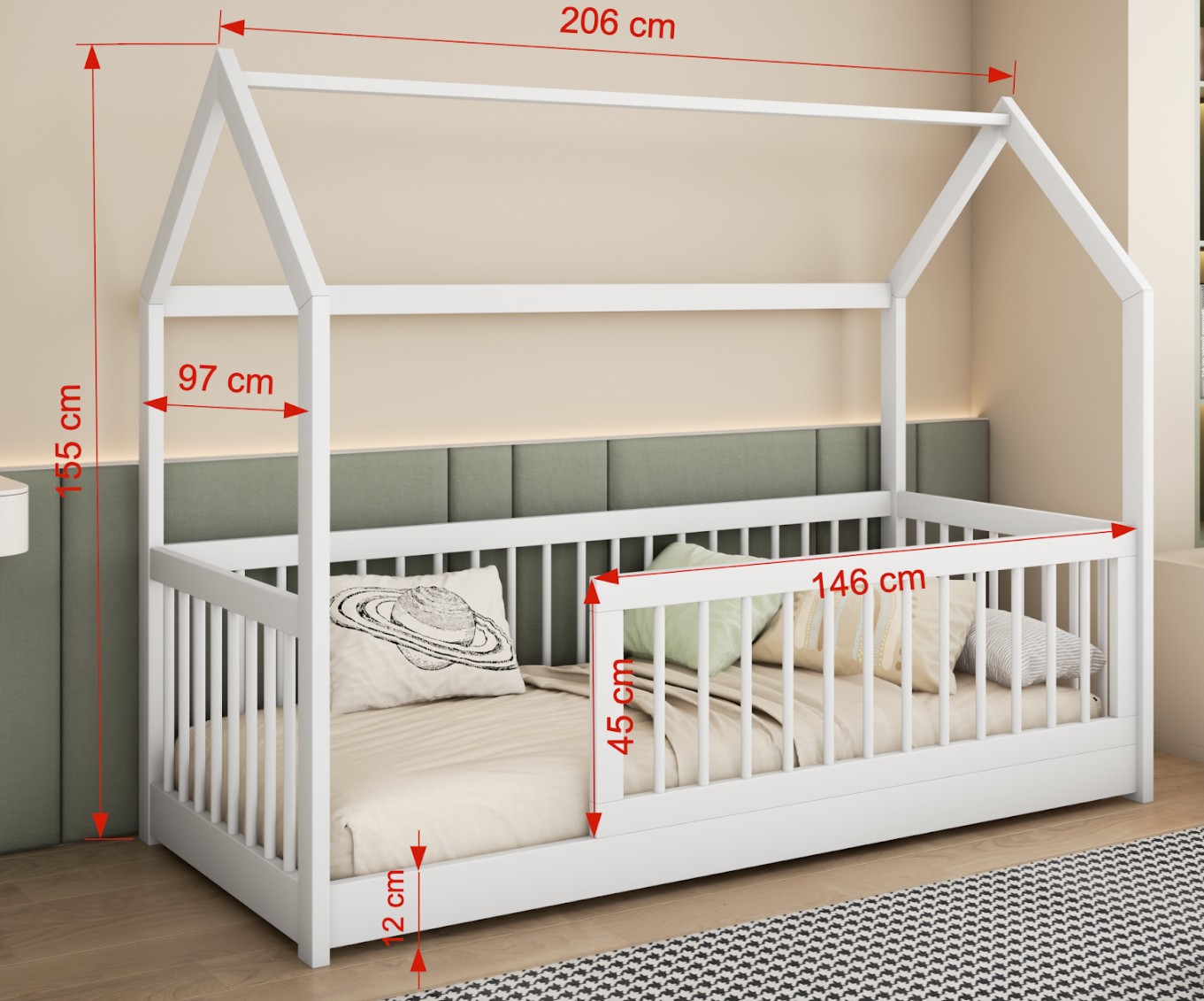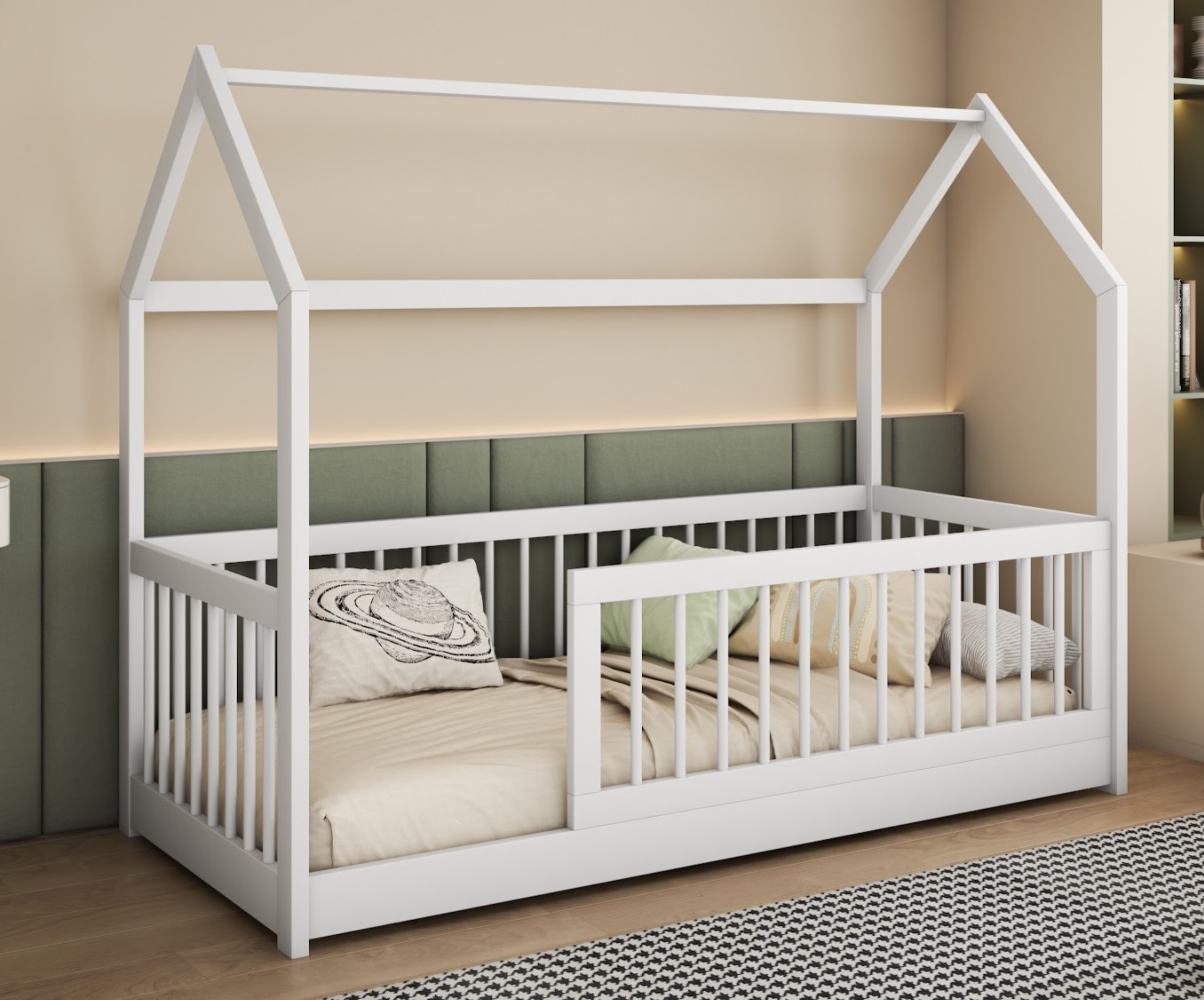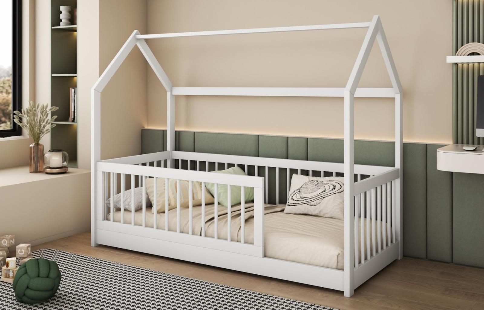 Dětská domečková postel z masivu borovice GRÉTA je skvělou volbou, pokud hledáte kvalitní a robustní postel, která je zároveň krásná a stane se ozdobou dětského pokoje. Postel se vyznačuje svou praktičností a atraktivním designem. Díky nízké konstrukci a volnému vstupu ji řadíme mezi Montessori nábytek. Princip Montessori klade důraz na volnost dítěte, což tato postel nabízí. Dítě má do postele volný přístup a díky tomu, že je postel nízká a chráněná bočnicemi, je také pro dítě bezpečná. Postel je vyrobena z velice kvalitního borovicového dřeva, které je ošetřeno třemi vrstvami ekologického laku. Tím je zajištěna vysoká odolnost postele vůči mechanickému poškození a různým druhům nečistot. Bezpečnost dětí zajišťují vysoké bočnice po obvodu postele a ochranná bariérka, díky čemuž se nemusíte obávat nechtěných pádů během spánku. Bariéra je navíc odnímatelná a je možné ji nainstalovat na pravou i levou stranu postele. Postel je navíc nízká a je proto vhodná i pro nejmenší děti.