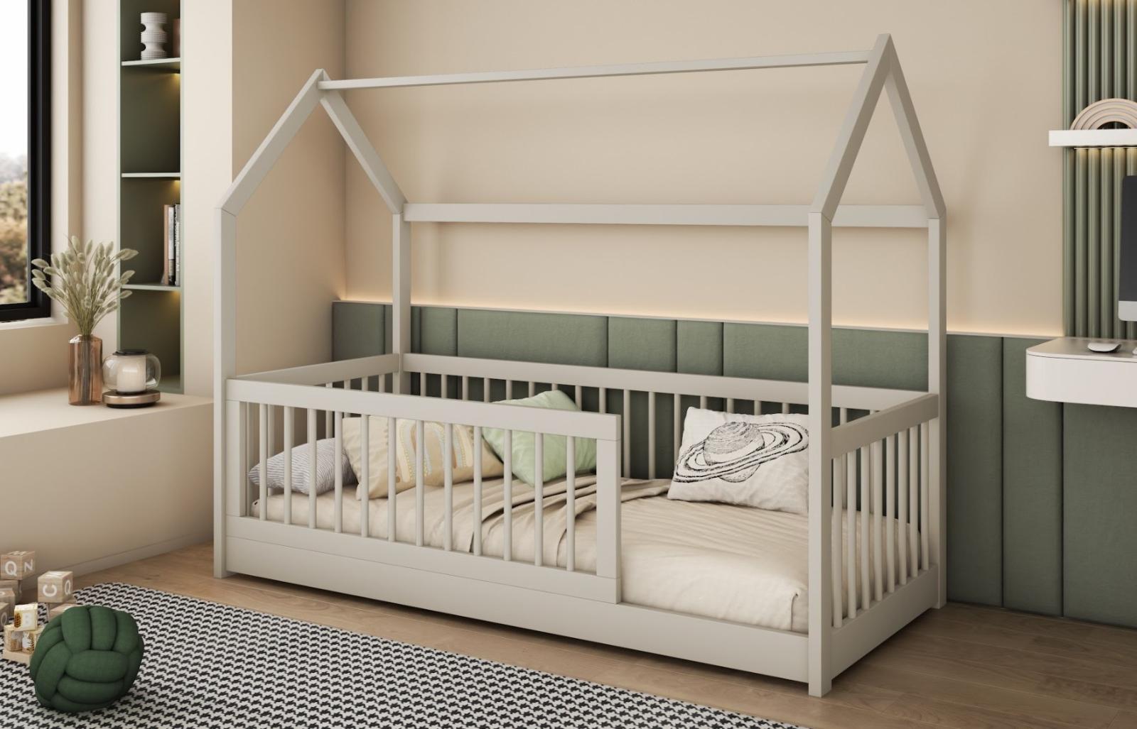 Dětská domečková postel z masivu borovice GRÉTA je skvělou volbou, pokud hledáte kvalitní a robustní postel, která je zároveň krásná a stane se ozdobou dětského pokoje. Postel se vyznačuje svou praktičností a atraktivním designem. Díky nízké konstrukci a volnému vstupu ji řadíme mezi Montessori nábytek. Princip Montessori klade důraz na volnost dítěte, což tato postel nabízí. Dítě má do postele volný přístup a díky tomu, že je postel nízká a chráněná bočnicemi, je také pro dítě bezpečná. Postel je vyrobena z velice kvalitního borovicového dřeva, které je ošetřeno třemi vrstvami ekologického laku. Tím je zajištěna vysoká odolnost postele vůči mechanickému poškození a různým druhům nečistot. Bezpečnost dětí zajišťují vysoké bočnice po obvodu postele a ochranná bariérka, díky čemuž se nemusíte obávat nechtěných pádů během spánku. Bariéra je navíc odnímatelná a je možné ji nainstalovat na pravou i levou stranu postele. Postel je navíc nízká a je proto vhodná i pro nejmenší děti.